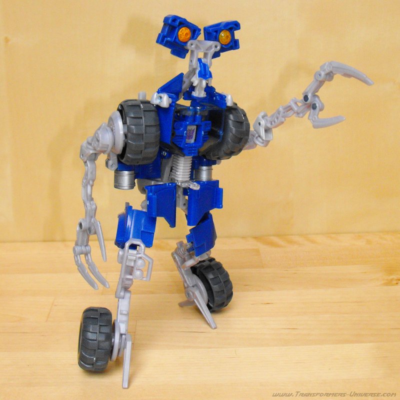 Posability-wise Wheelie offers no room for complaint. He's extremely bendy. His legs, the almost mandatory multi-jointed chicken legs, give him a stable platform despite being very thin and by stretching or hunching down Wheelie can change his height by several centimeters. His arms are also very posable and each hand is composed of three claw-like fingers, each on a separate joints. Wheelie can easily grab hold of stuff and his shoulder joints are tight enough for him to hold them aloft without problems.