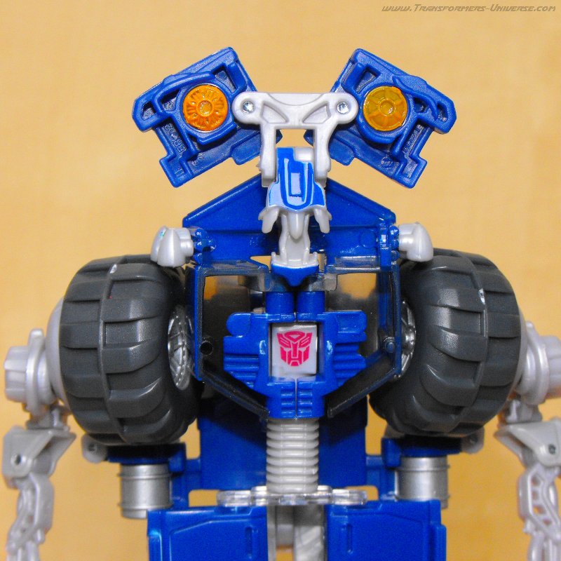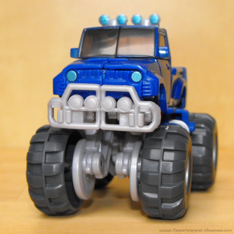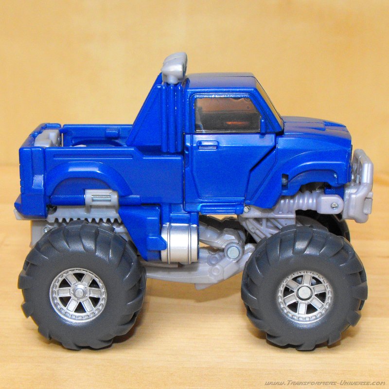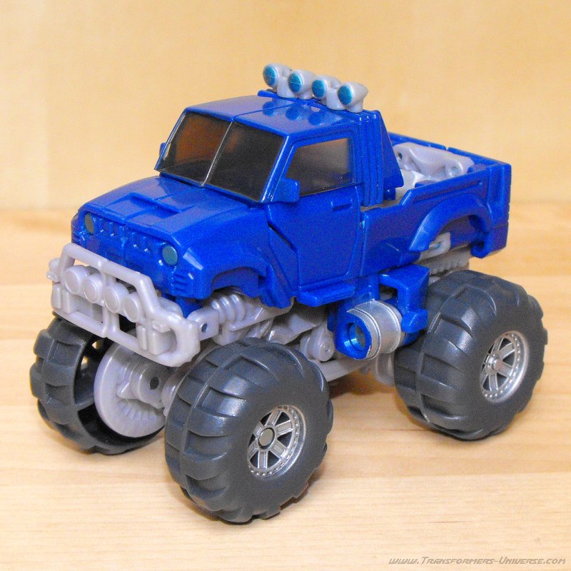 Alternate Mode: Wheelie folds together into a blue monster truck. In his case it's actually supposed to be a toy truck, not an actual one. This isn't used as an excuse for lack of detailing, though. Granted, Wheelie doesn't look quite as realistic as other Deluxe Transformers have managed, but he does make for a pretty convincing truck with quite a few sculpted details. Wheelie's face actually forms the rear of the vehicle mode, so you can sort-of see it when you look into his open rear. Doesn't hurt the vehicle mode any, though, just worth mentioning. So all in all a good vehicle mode without any flaws.