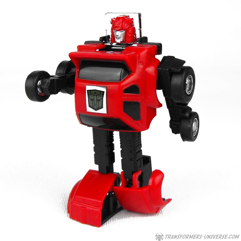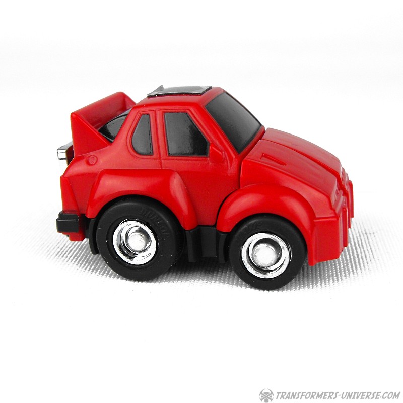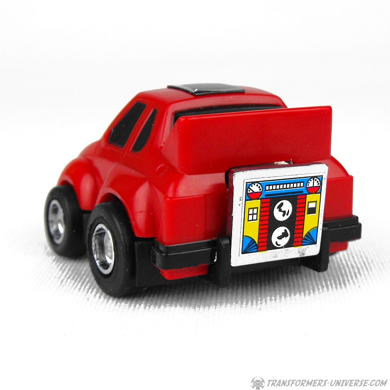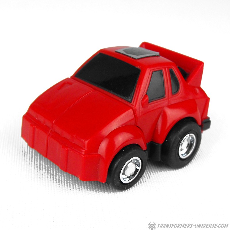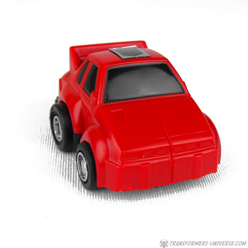 Alternate Mode: Cliffjumper transforms into a very much deformed miniature version of a Porsche 924 Turbo. The car is all-red with black windows and actual rubber tires with silver rims. Not sure what else to write, really. The car looks good for a small Penny-Racer type vehicle and there are no visible robot bits, not even from underneath. So bottom line, a fully sufficient vehicle mode from a time when transforming into a vehicle was the actual gimmick of the line.
