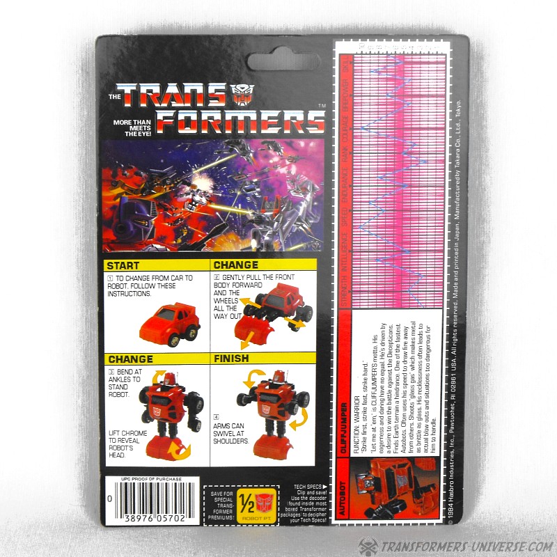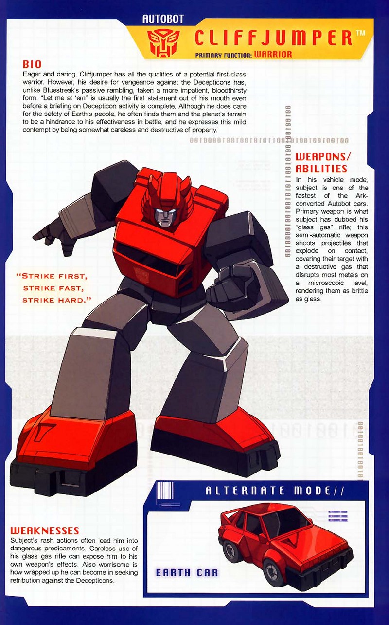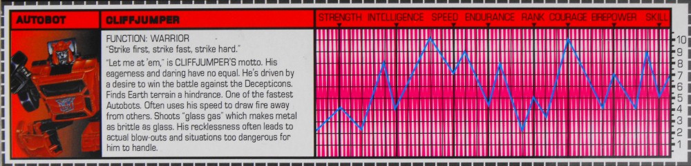 "Let me at 'em," is Cliffjumper's motto. His eagerness and daring have no equal. He's driven by a desire to win the battle against the Decepticons. Finds Earth terrain a hindrance. One of the fastest Autobots. Often uses his speed to draw fire away from others. Shoots 'glass gas' which makes metal as brittle as glass. His recklessness often leads to actual blow-outs and situations too dangerous for him to handle.