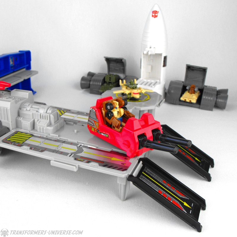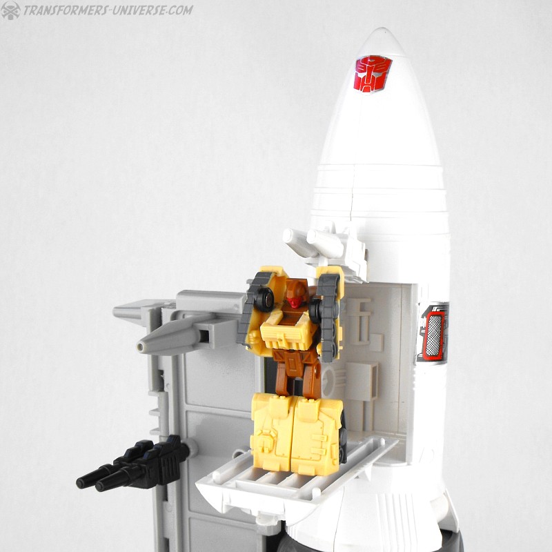 Apart from seating Micromaster robots in the gunnery and cockpit modules, you can also open up the hatch of the rocket and place one in there. The gantry tower can fold away for launch of the rocket and has an elevator on the back. You can also attach one of Countdown’s black platforms to the tower (not pictured above, noticed it too late) to provide access from the elevator to the hatch of the rocket. Overall I like this mode very much. Oh, and side note: in Japan you were supposed to remove Countdown’s rocket and instead launch the separate Transformers figure Galaxy Shuttle from the launch pad. Either way, a pretty good mode.