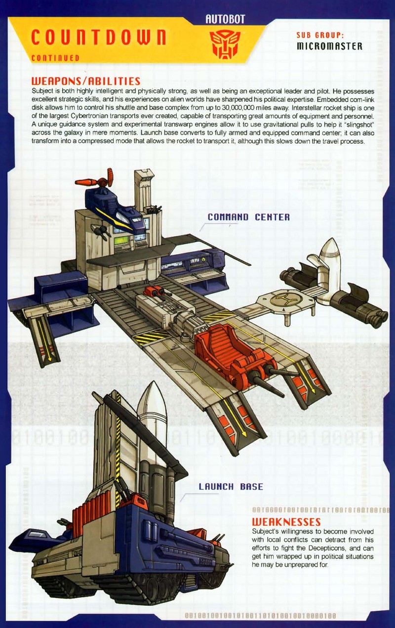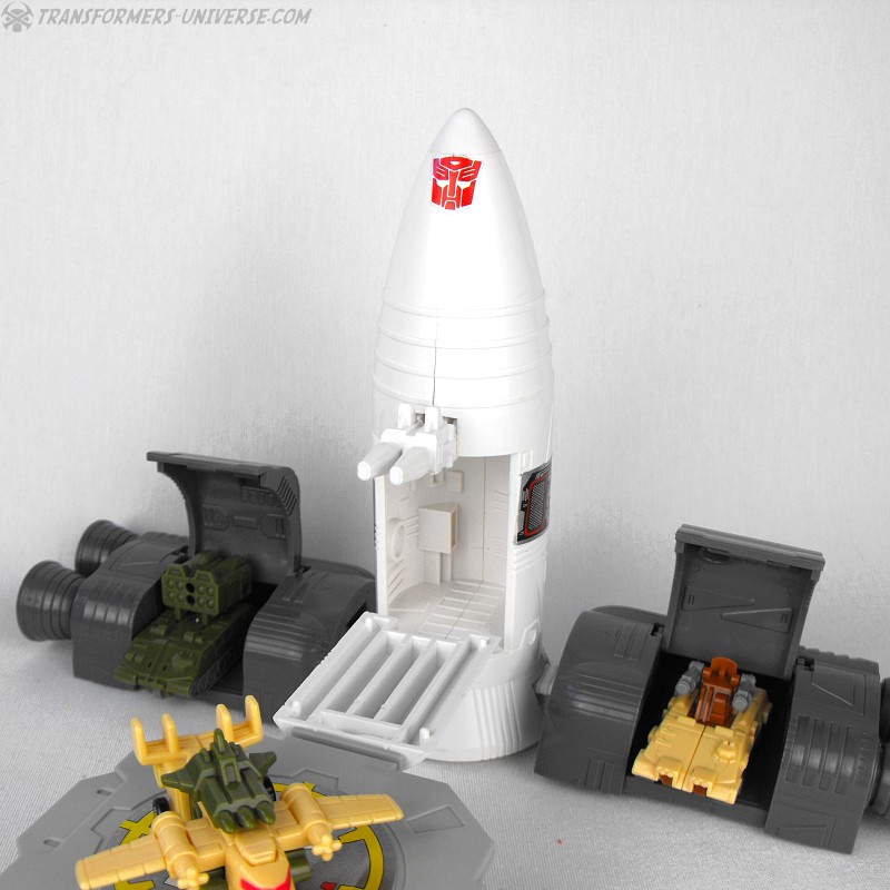 Remarks: Countdown, the robot, has a few comic book appearances under his belt, most notably in the Dreamwave Micromaster miniseries. The rocket base, however, has turned up quite a few times in Japanese cartoons. It served as the headquarters of Star Saber’s team in the Victory cartoon and was later part of the defense of Planet Zone in the first (and only) episode of Transformers: Zone. Countdown’s rocket base was also the biggest toy sold in 1989, a year when Transformers began to shrink down more and more.