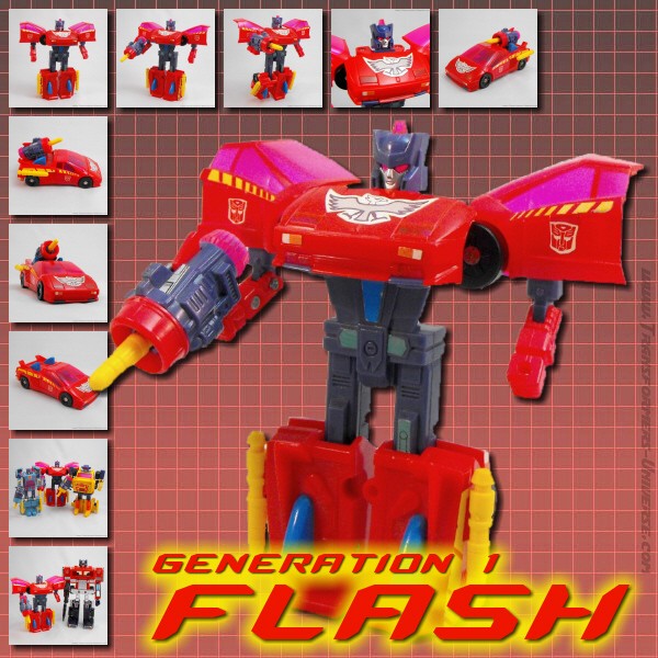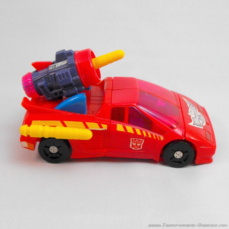 Vehicle Mode: Flash transforms into a red sports car, no specific model. There is a big eagle sticker on the hood and yellow stripes on the sides. The highlight is, of course, the big turbine weapon that sits on the car’s back. It doubles as big-ass engine and weapon, capable of angling upward to aim missiles at flying enemies. The spare missiles can attach to the side of the car for storage. The only downside here is that you can clearly see Flash’s robot face through the transparent windshield. Apart from that, though, a pretty cool vehicle mode. Thumbs up.
