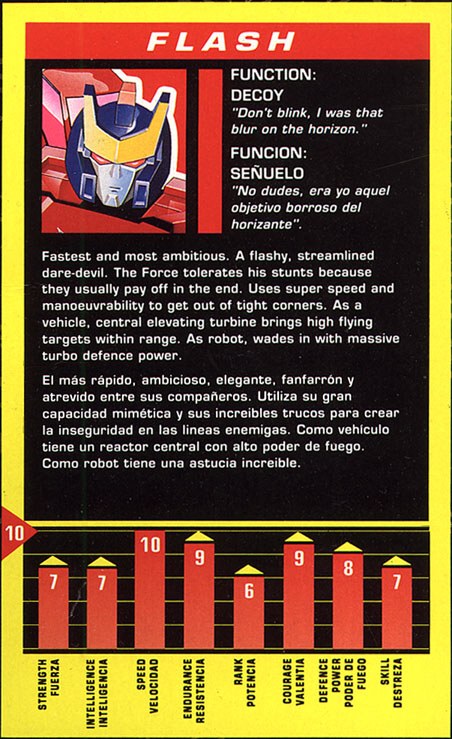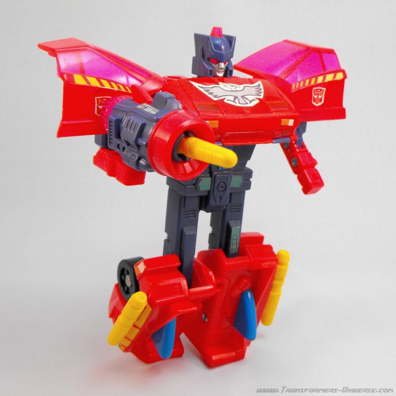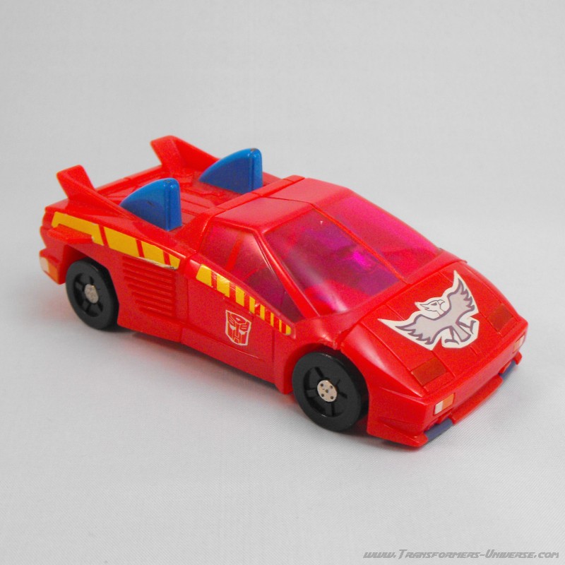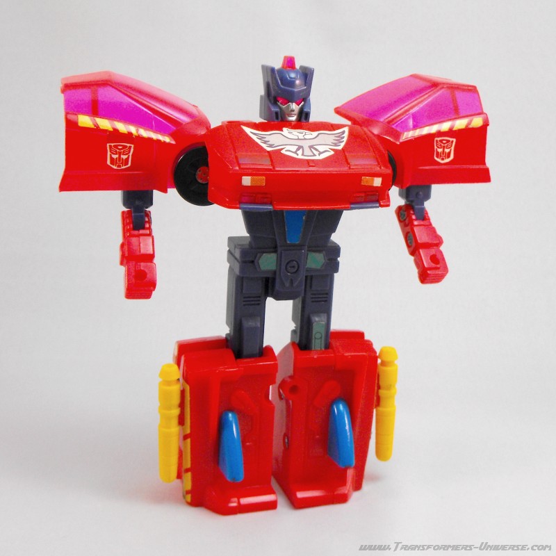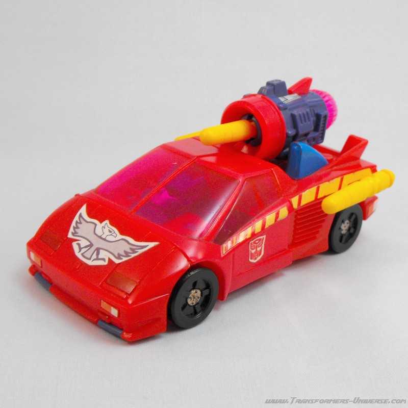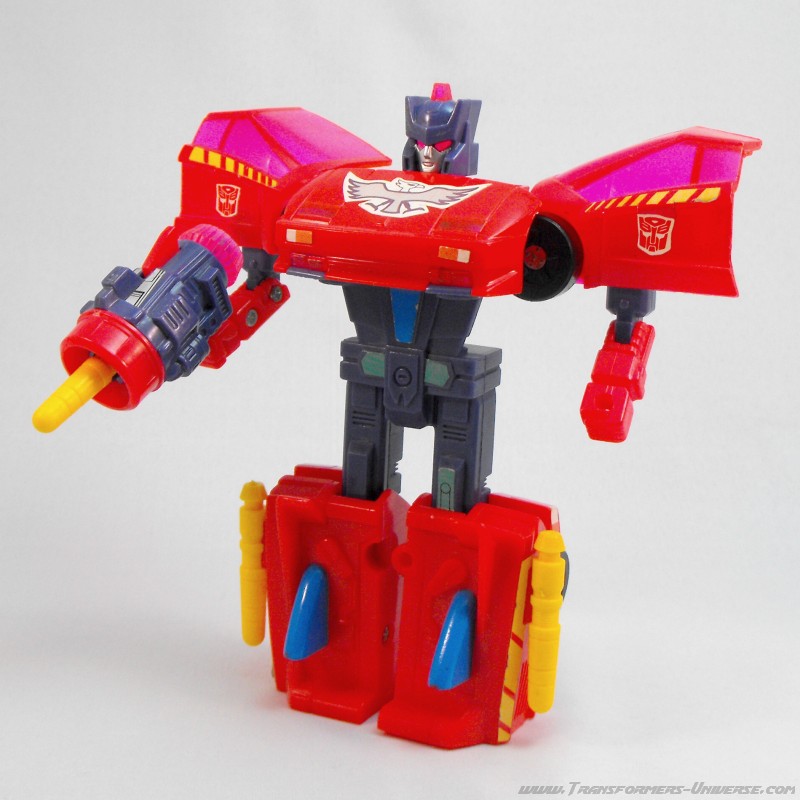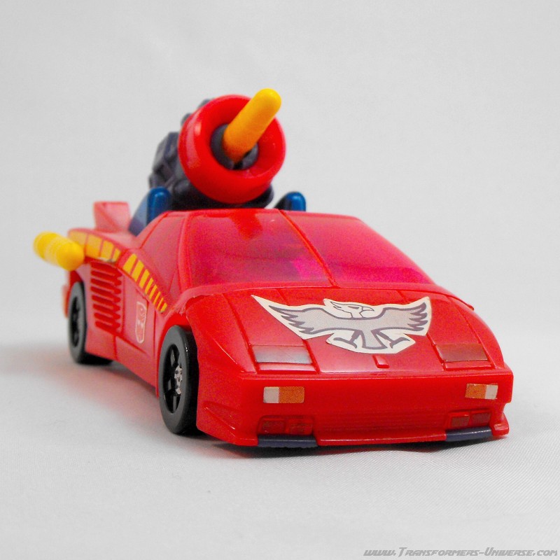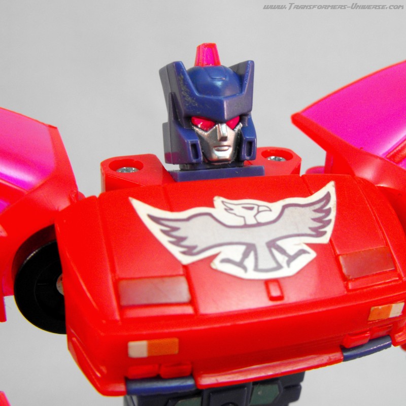 Fastest and most ambitious of the Turbomasters; a flashy, streamlined dare-devil. The group tolerates his stunts because they usually pay off in the end. Uses super speed and maneuverability to get out of tight corners. As a vehicle, central elevating turbine brings high flying targets within range. As robot, wades in with massive turbo defense power.