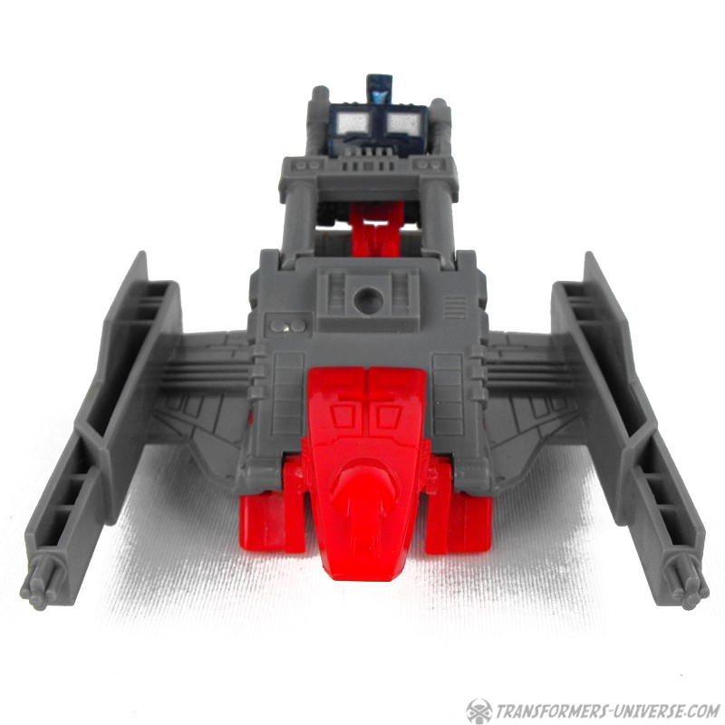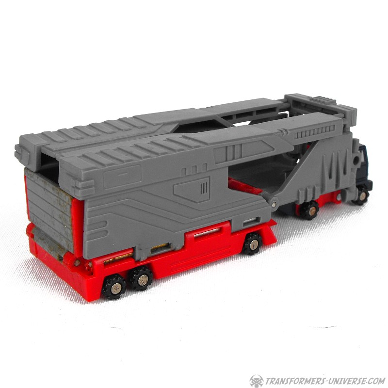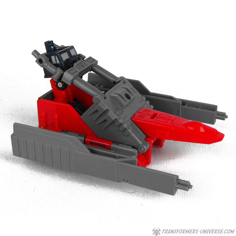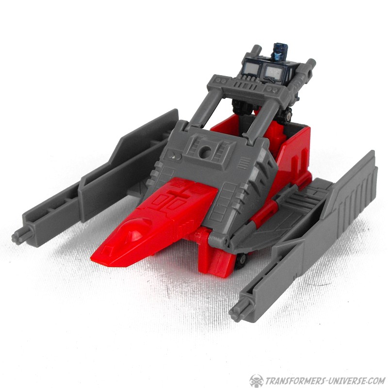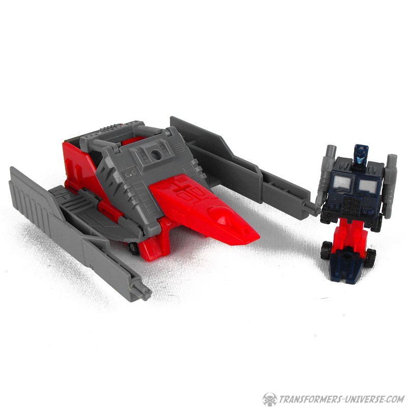 A bold and daring soldier. Often breaks away from cargo-hauling missions to join his fellow Autobots on the battlefield. A tactical genius on the front line. Trailer converts to turbo-boosted, supersonic fighter jet armed with wing-mounted, double-barrelled machine guns. Laser-guided, lock-target scanners provide pinpoint firepower. Capable of reaching speeds in excess of Mach 2. Also equipped with hydrofoil capabilities.
