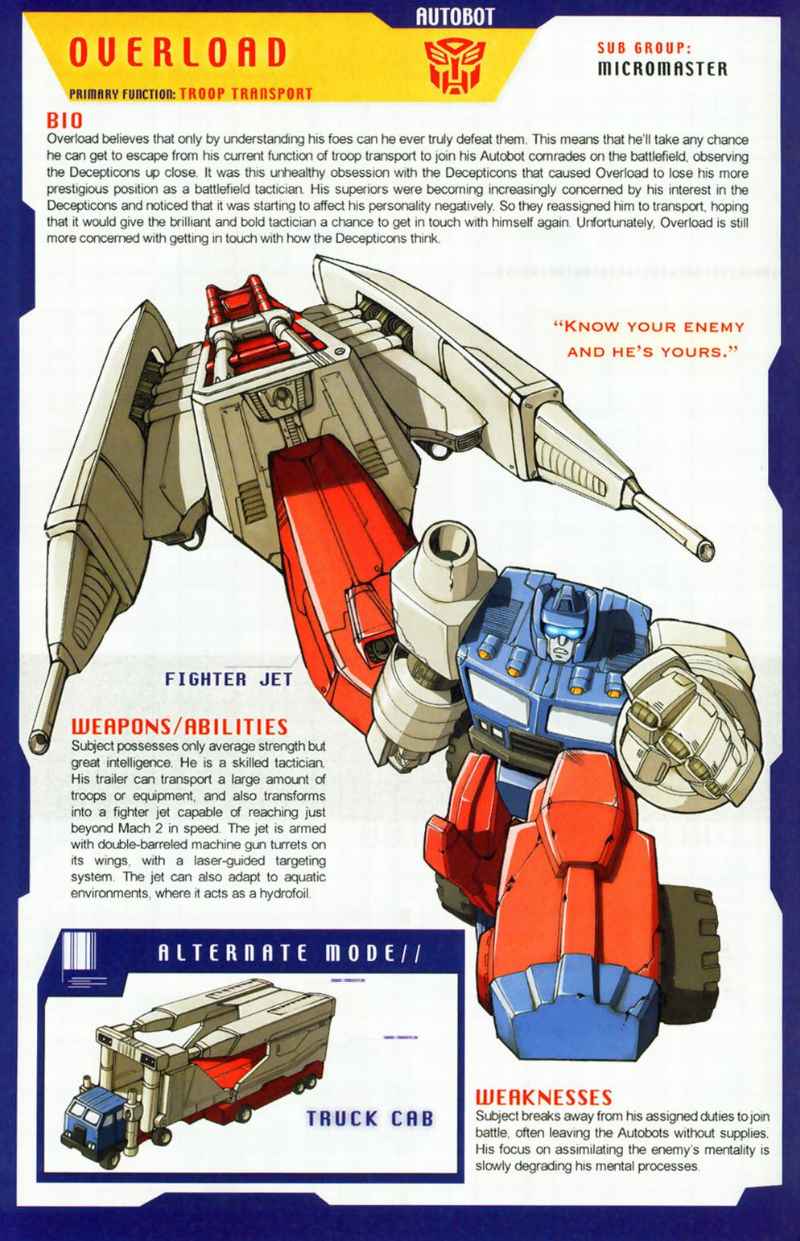 Remarks: I never really liked the Micromasters. Born out of Hasbro's attempt to partake in the success of Matchbox's Micro Machines, they were small, barely detailed, barely posable, and just plain boring for the most part. Overload's one claim to fame is that he gave his name to the Armada figure of the same name. I got him as part of a small collection I bought, otherwise I wouldn't have bothered.