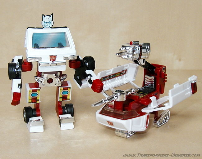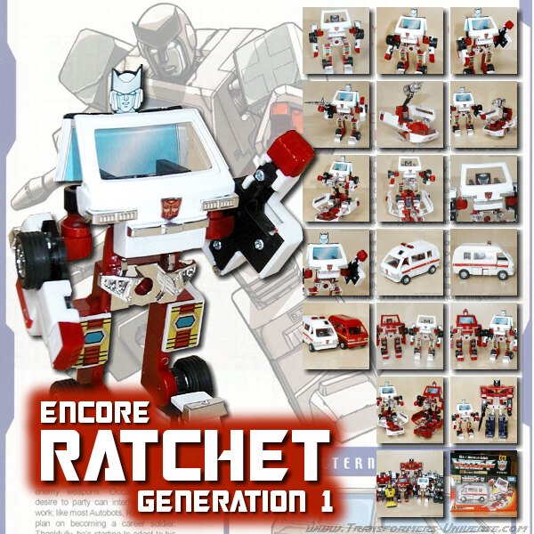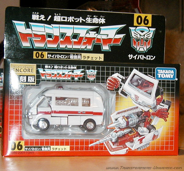 Remarks: Ratchet was one of the original Autobot cast and appeared in the first two seasons of the G1 cartoon before being killed during Transformers the Movie (the 1986 animated one, that is). He was one of the more likeable characters, always complaining about the work he had to do, but always fixing up his buddies without fail. He was pretty much the same in the comic books, though he did feature more heavily there, at one time being the only Autobot left free to save his fellows. Ratchet also features frequently in the IDW series of comics.