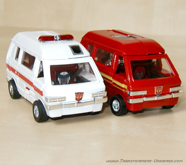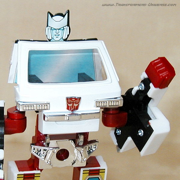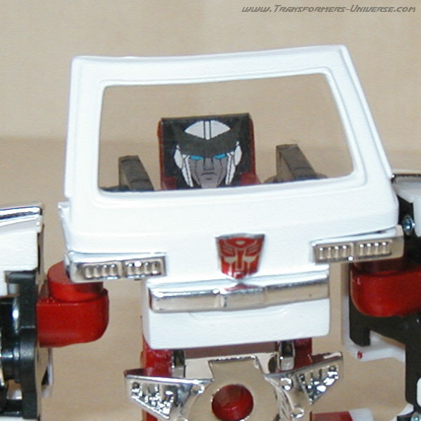 Reprolabels issues special stickers so you could have Ratchet's face on the seat behind the windshield, turning him into a rather stocky robot, but at least now he's recognisable. This design was actually an inspiration for several War Within designs used in Dreamwave's comic book series. The Encore series went one step further and included a cardboard cut-out you can stick in front of the driver's seat, giving Ratchet a (two-dimensional) head that actually sits in top of the windshield instead of behind it.