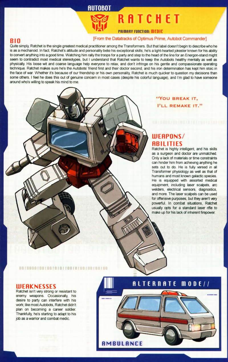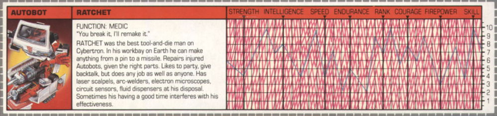Ratchet was the best tool-and-die man on Cybertron. In his workbay on Earth he can make anything from a pin to a missile. Repairs injured Autobots, given the right parts. Likes to party, give backtalk, but does any job as well as anyone. Has laser scalpels, arc-welders, electron microscopes, circuit sensors, fluid dispensers at his disposal. Sometimes his having a good time interferes with his effectiveness.