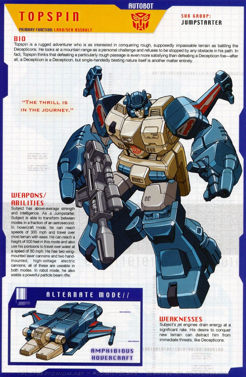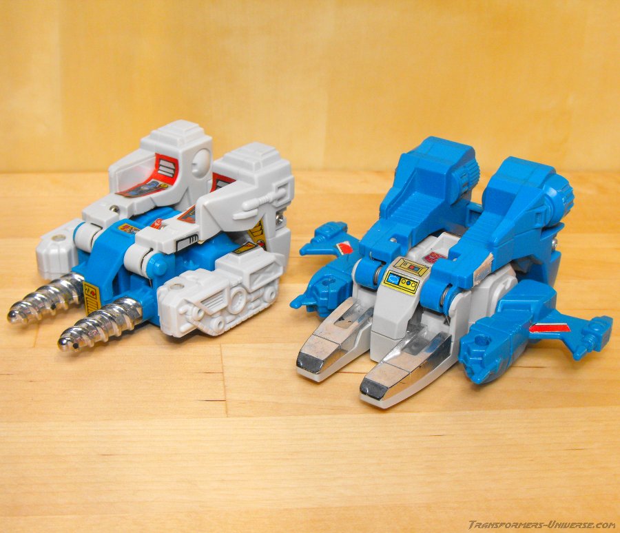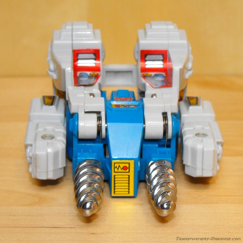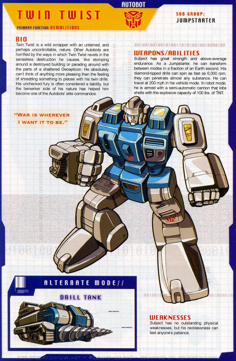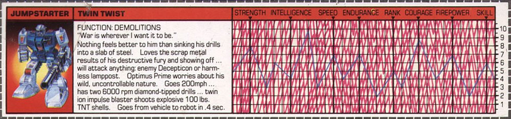 Remarks: Pretty much the only reason why anyone remembers the Jumpstarters is because they were part of the Wreckers, the Autobots' elite combat unit first created in the old Marvel UK comic books. They consisted mostly of toys that were never seen in the cartoon series, so Topspin and Twin Twist fit right in. The two of them partook in the ill-fated Operation: Volcano and later in the even more ill-fated fight against Megatron and Galvatron during the Time Wars, where they both died (as most Wreckers do sooner or later). The two of them have appeared as members of the Wreckers in just about every comic-book incarnation of Generation 1 since. Oh, and Twin Twist seems to have a real fetish for drilling into the feet of vastly superior foes such as Devastator, Menasor and Thunderwing, usually with less than pleasing results.