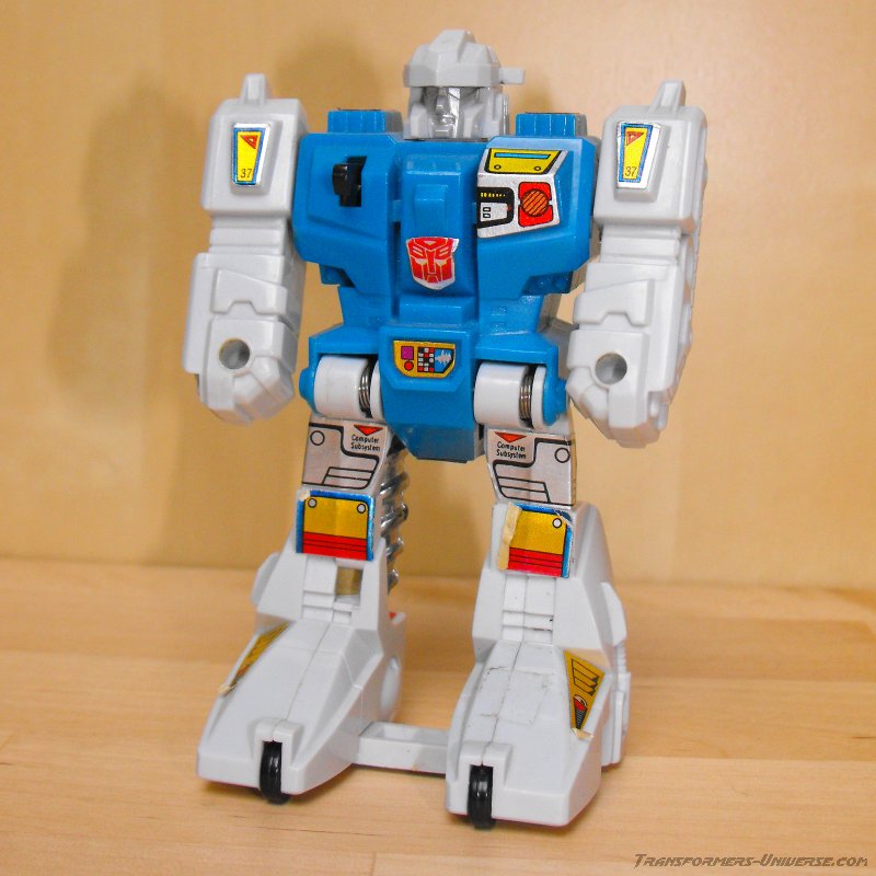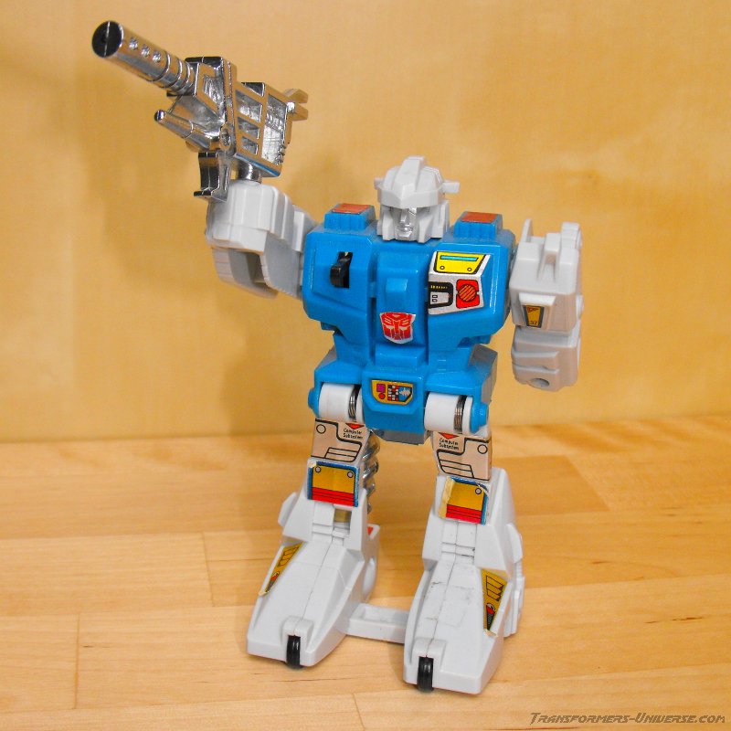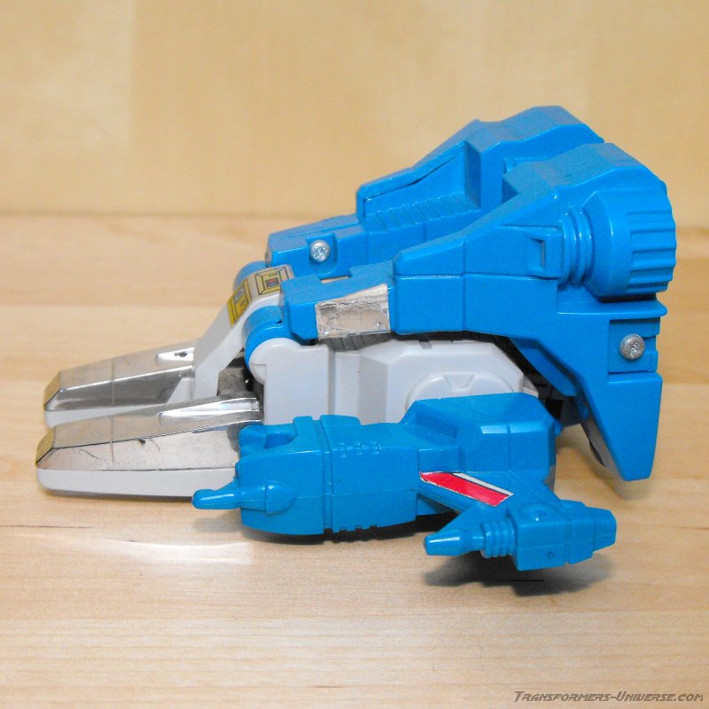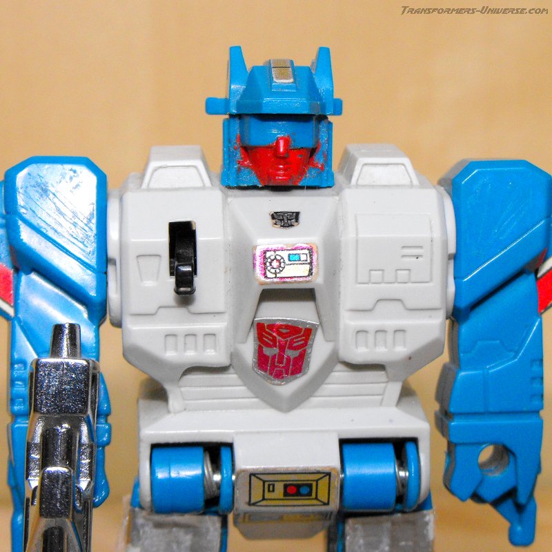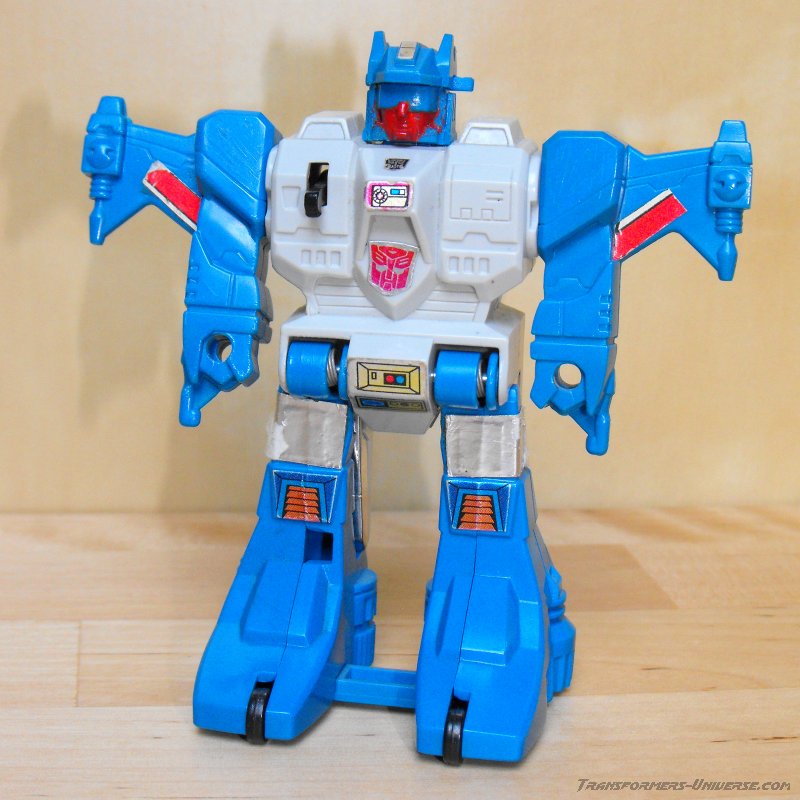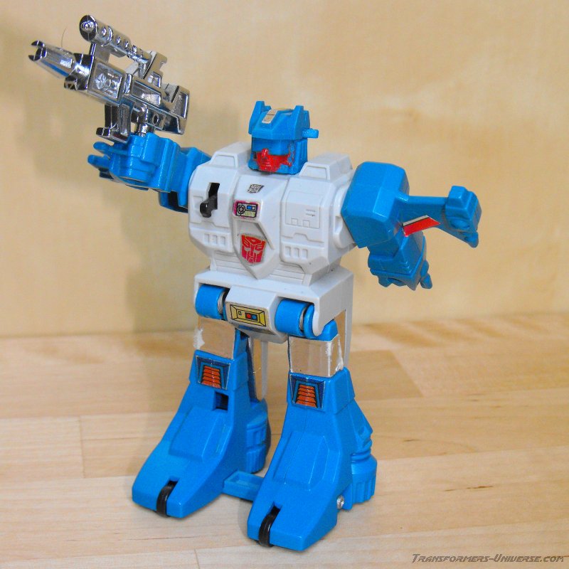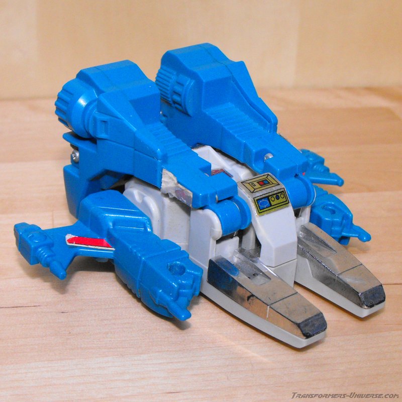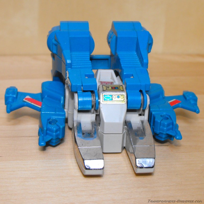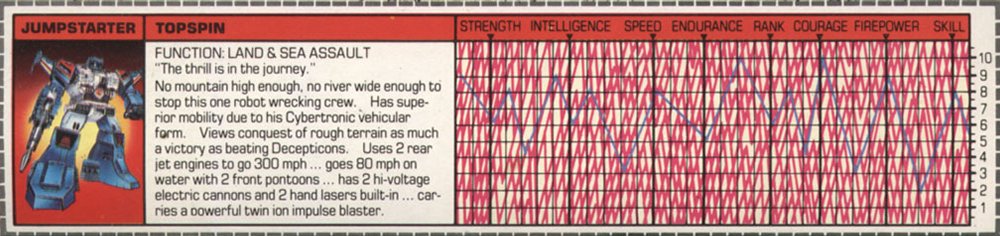 No mountain high enough, no river wide enough to stop this one robot wrecking crew. Has superior mobility due to his Cybertronic vehicular form. Views conquest of rough terrain as much a victory as beating Decepticons. Uses 2 rear jet engines to go 300mph... goes 80mph on water with 2 front pontoons... has 2 hi-voltage electric cannons and 2 hand lasers built in... carries a powerful twin ion impulse blaster.