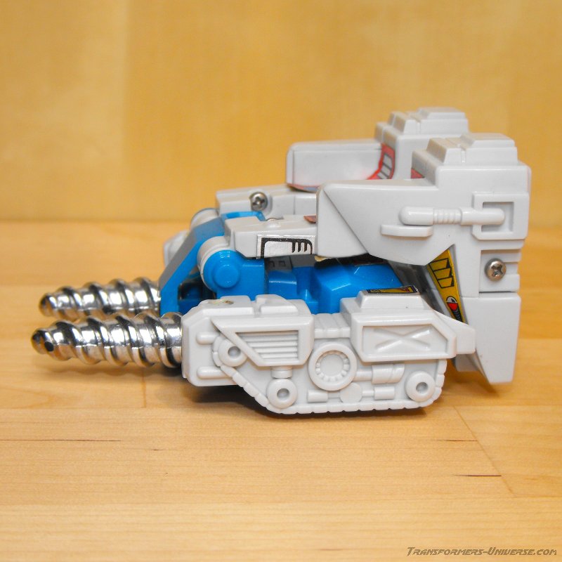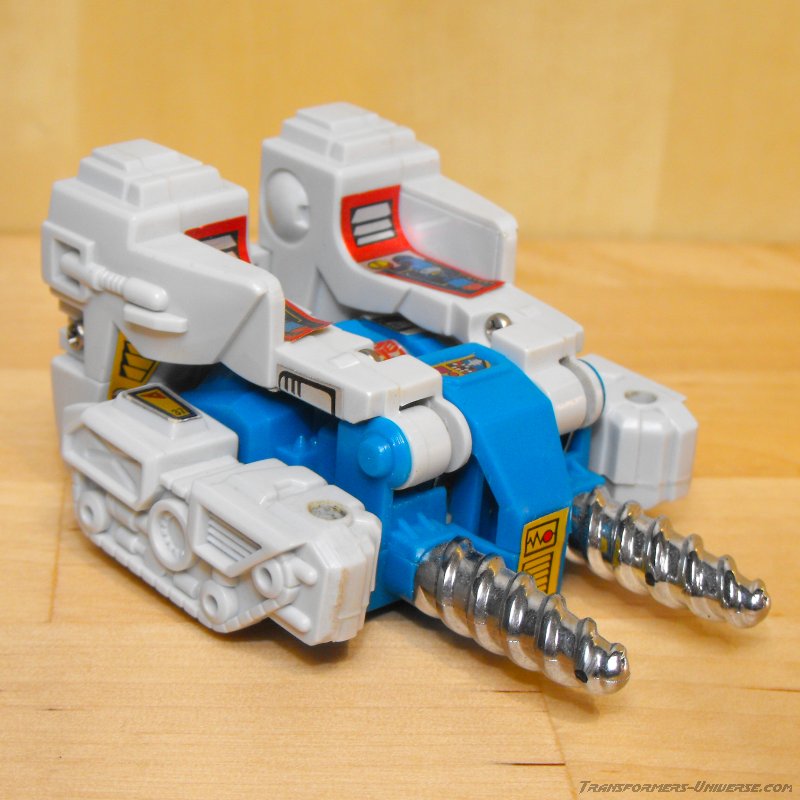 Nothing feels better to him than sinking his drills into a slab of steel. Loves the scrap metal results of his destructive fury and showing off... will attack anything: enemy Decepticon or harmless lamppost. Optimus Prime worries about his uncontrollable nature. Goes 200mph... has two 6000rpm diamond-tipped drills... twin ion impulse blaster shoots explosive 100lb TNT shells. Goes from vehicle to robot in .4 seconds.