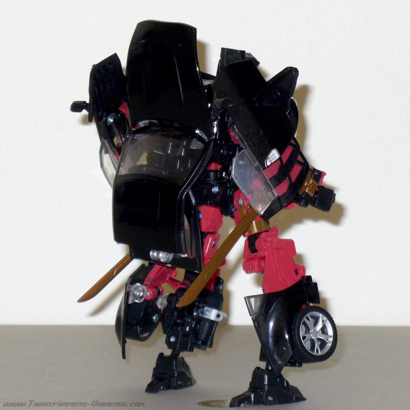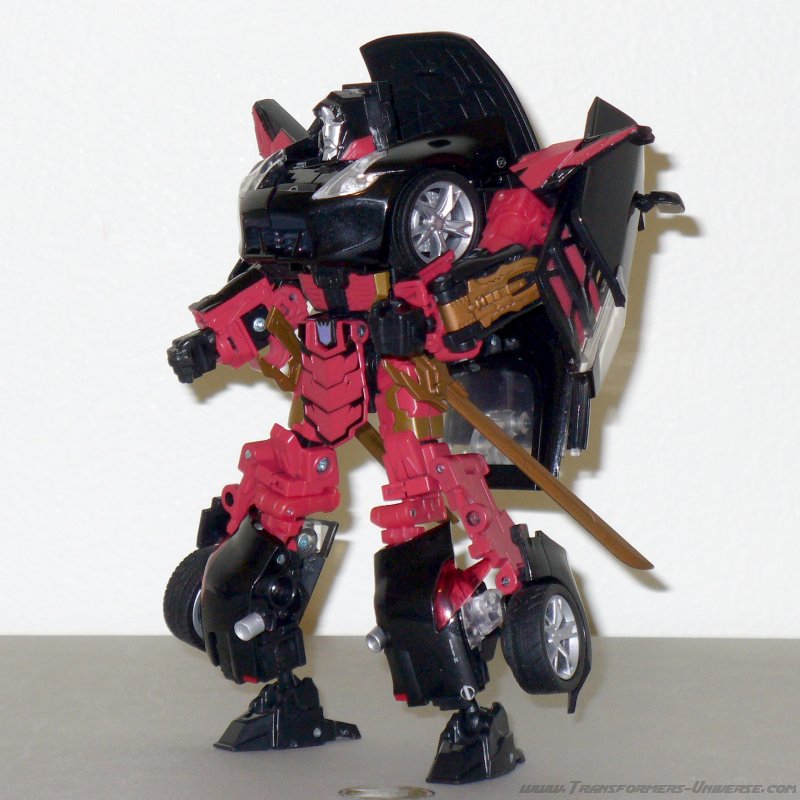 He has good sculpting, even for modern Transformers, which really makes the samurai image stand out. Most of his body has various car parts arranged in a way as to mimic pieces of armor from Japanese history. My favorite pieces are his doors. They slide open to reveal more plates for his shoulder armor. Most of his samurai aesthetic is obvious, but one final piece did it in for me. On the back of his head is the engine block. Combine that flat piece with his usual helmet and you have a Kabuto warrior’s helmet. From the knees up he looks great, but those lower legs hurt him. In addition to the obvious bow-legged look, the wheels tab in on the outside of his shin which gives him some really large calves.