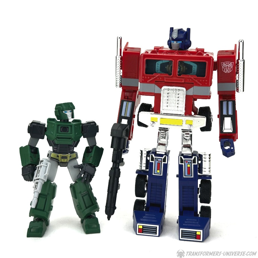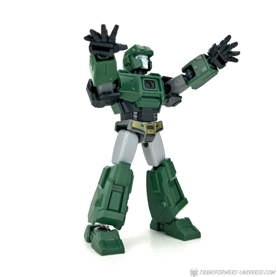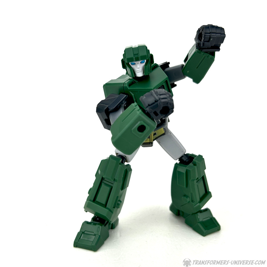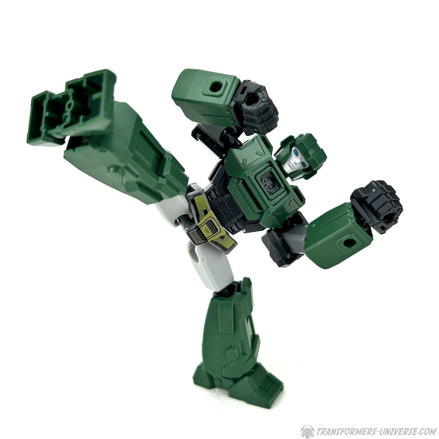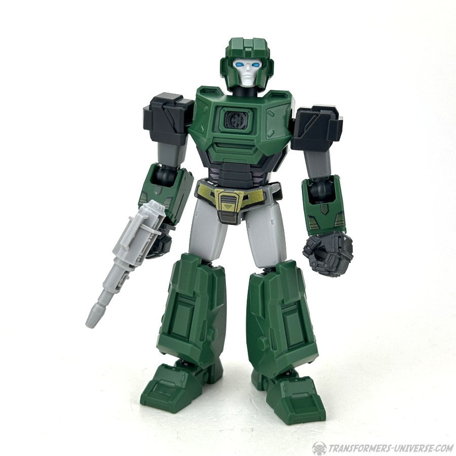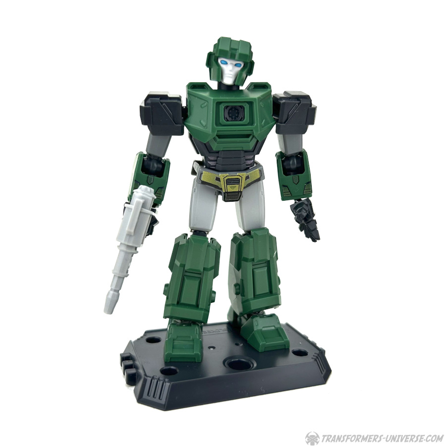 Robot Mode: All Blokees figures are model kits, meaning they come in parts and need assembly. Hound here is the so-called Galaxy Version size class, bigger than the Defenders, smaller than the Classics. The assembly is pretty easy if you follow the instruction sheets (a meta commentary on the movie, perhaps?) and once you’re done you have a Hound figure that is roughly Scout-Class (or very small Deluxe).