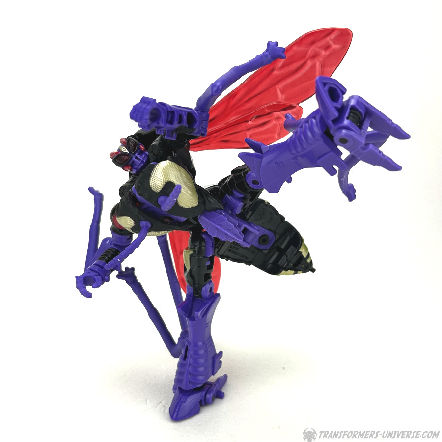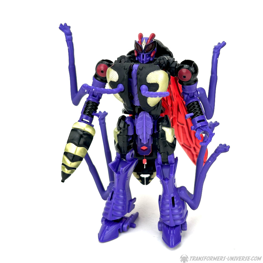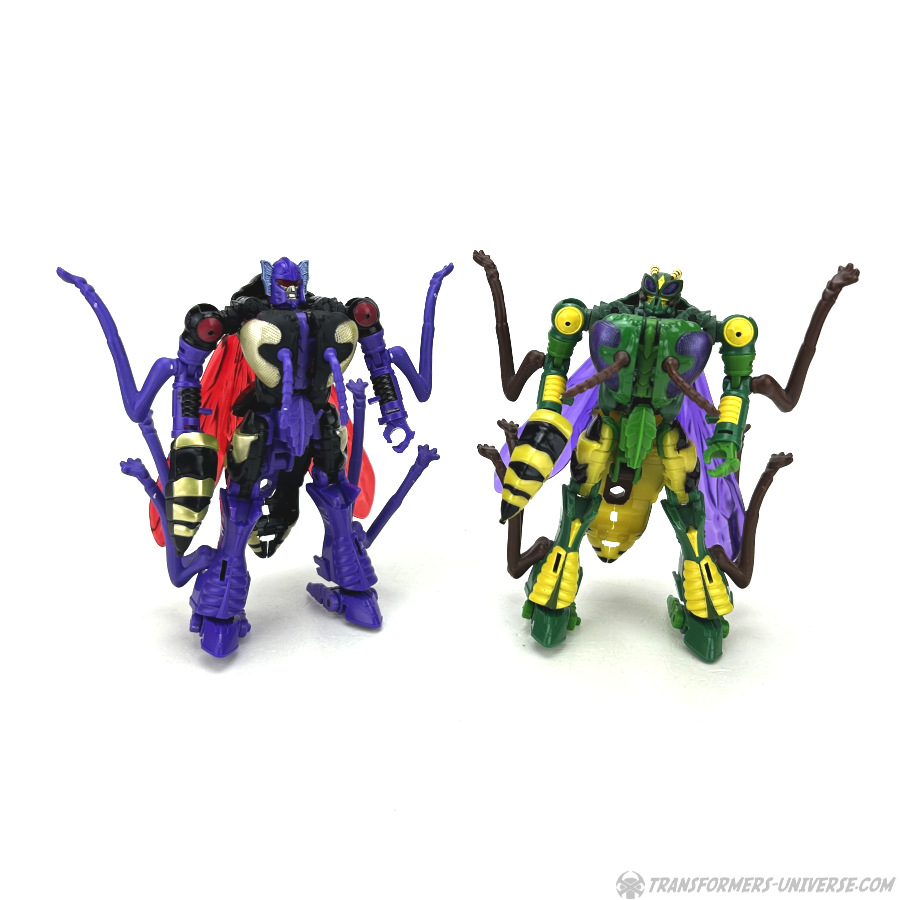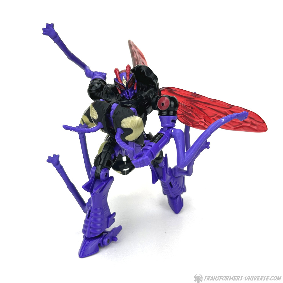 Skywasp is a straight-up repaint, but comes with an additional head you can switch out for the standard Waspinator noggin’. The head is based on the non-Mutant head of the original Beast Wars Waspinator figure (the one used for Buzzsaw), just in purple instead of green.