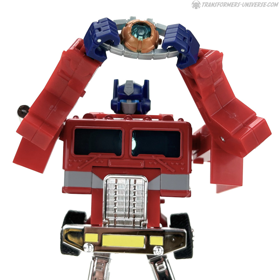 Alternate Mode: Nothing really new here. Optimus Prime transforms into his classic semi-truck form and, judging purely by the truck mode, you don’t really see any difference to the original figure. Of course there is no more room for Diaclone driver figures, due to the Matrix and Matrix holder in the chest, but otherwise this might as well be the original toy. The transformation itself is mostly the same, the only differences being that the fists fold in instead of detaching and that the hip has an extra transformation step. That’s pretty much it. The tractor is fully compatible with the old G1 trailer, naturally. So bottom line here: basically the same truck we had back in the 80s.