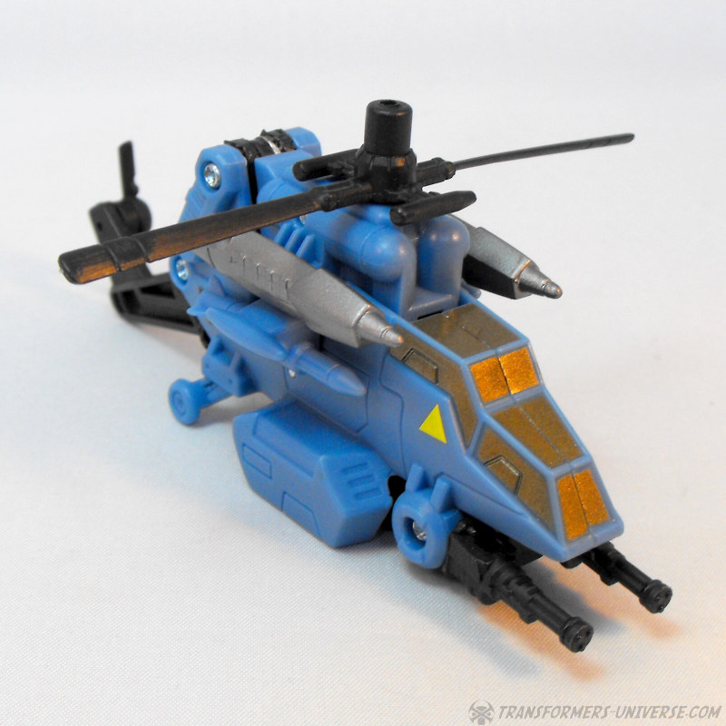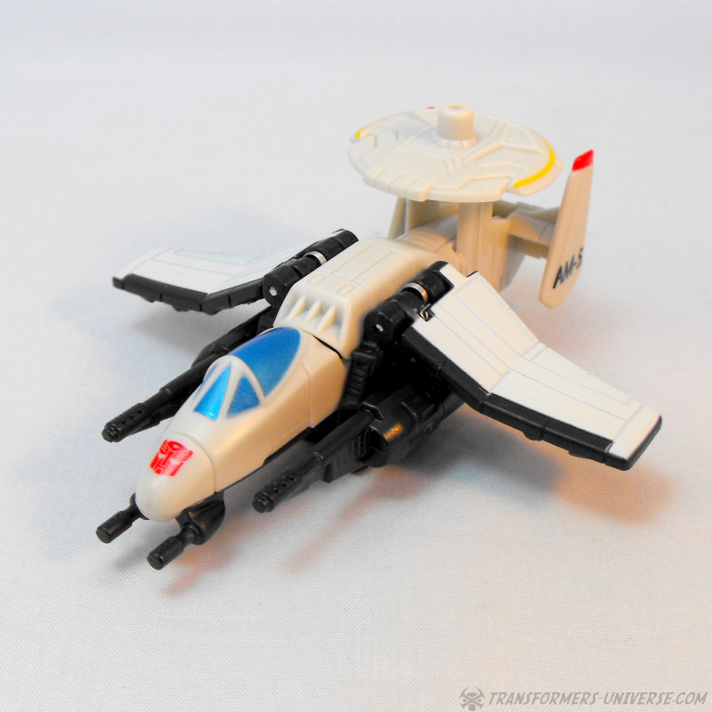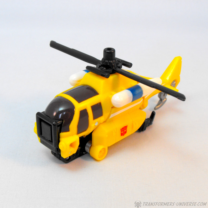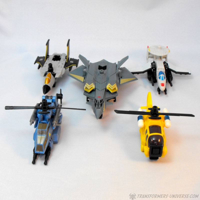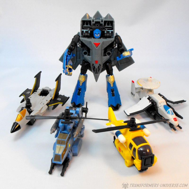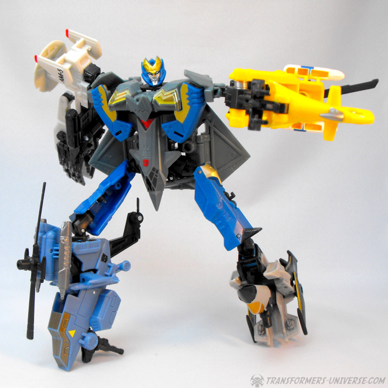 Partners: Skyburst comes with four drones that can form the limbs of his combiner mode (see below). The Aerialbot drones are all aircraft, naturally, though there is little in the way of resemblance to the original G1 Aerialbots to be found here. We have a white jet with an AWACs dish on top, a grey and black jet that reminds me of Ramjet, a blue helicopter that is an almost spitting image of G1 Whirl, and a yellow helicopter that doesn’t resemble any Transformer I know. All four are nice-looking vehicles, but their play value is pretty much restricted to the combiner mode.