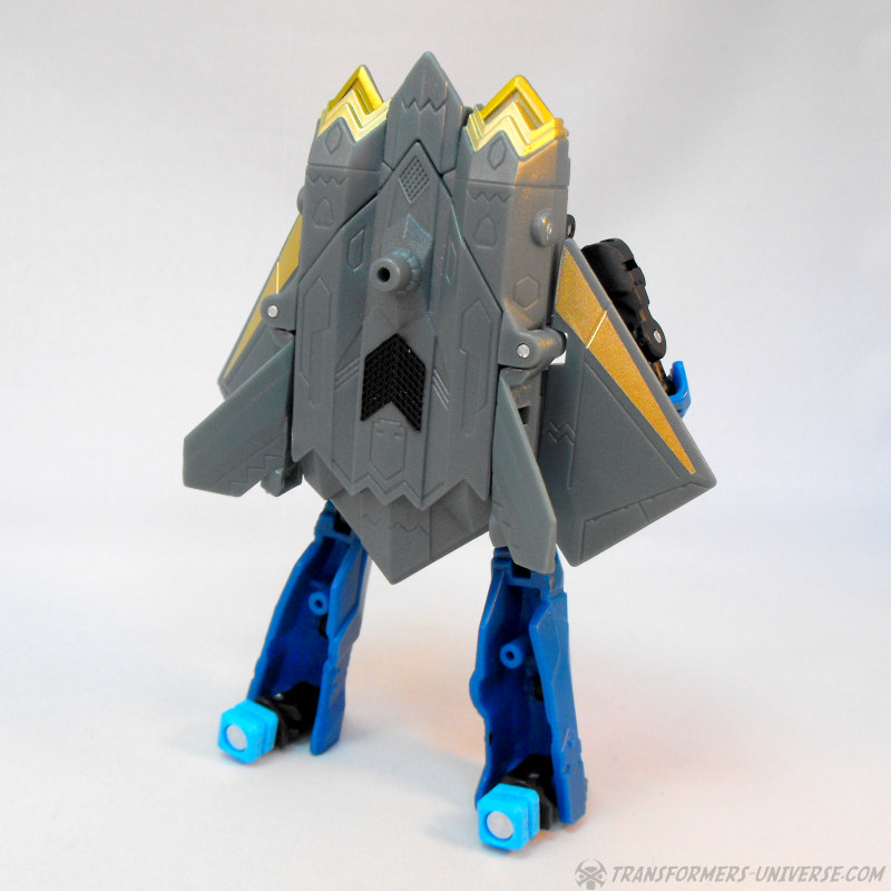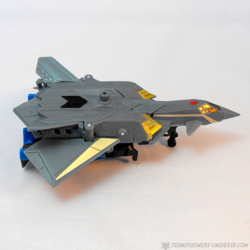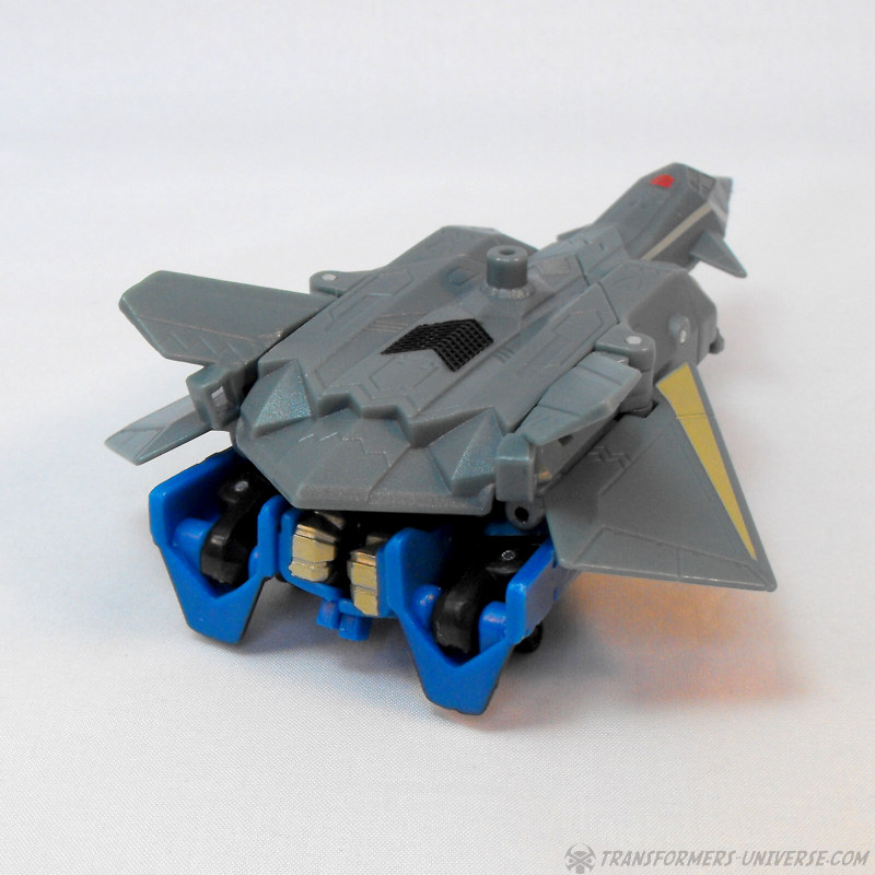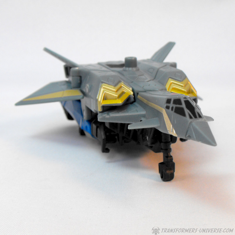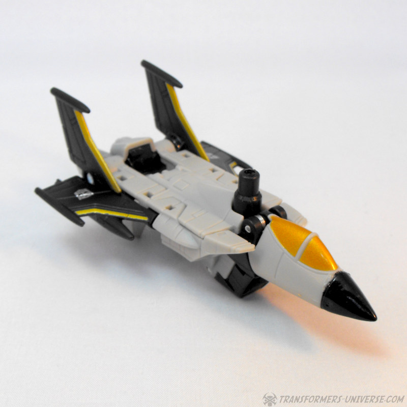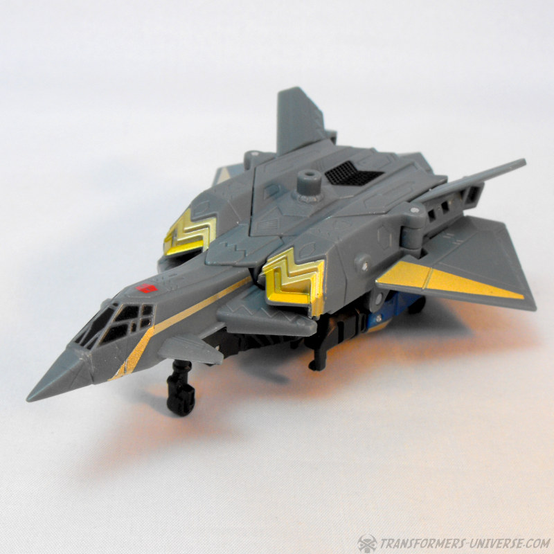 Alternate Mode: Skyburst transforms into a grey jet of no particular model. The jet suffers from a common jet-former ailment, a large undercarriage that basically comprises most of his robot mode. Apart from that, though, the jet looks pretty good. It has a working landing gear, nice paint detailing, and just looks good. Certainly not a revolutionary jet mode, but fully workable.