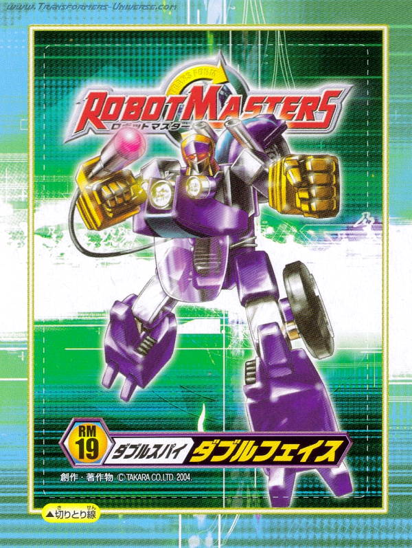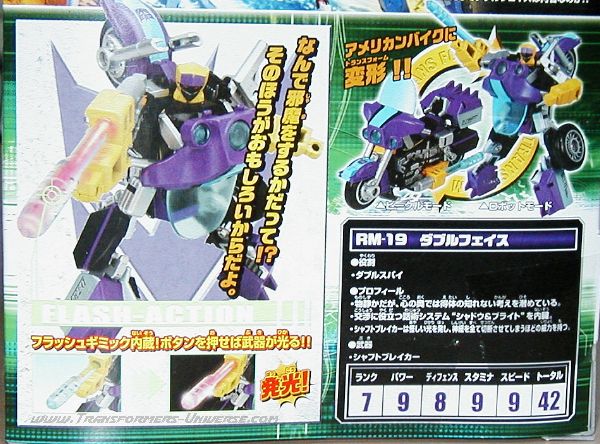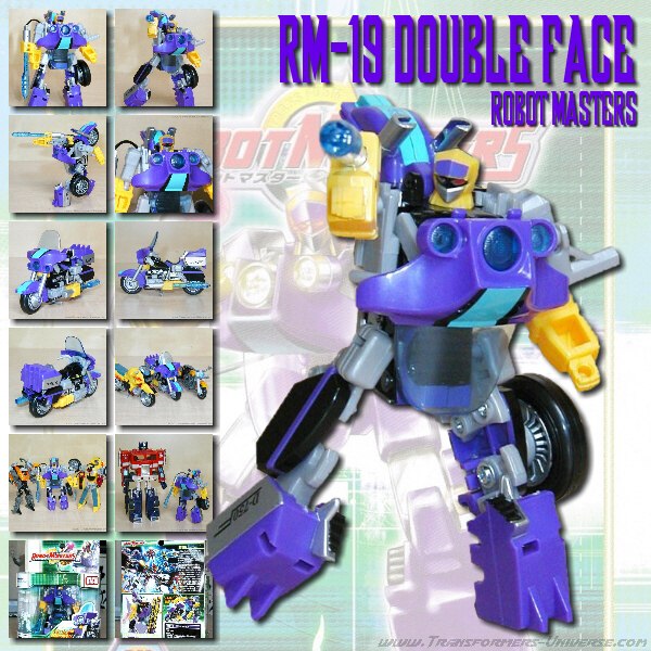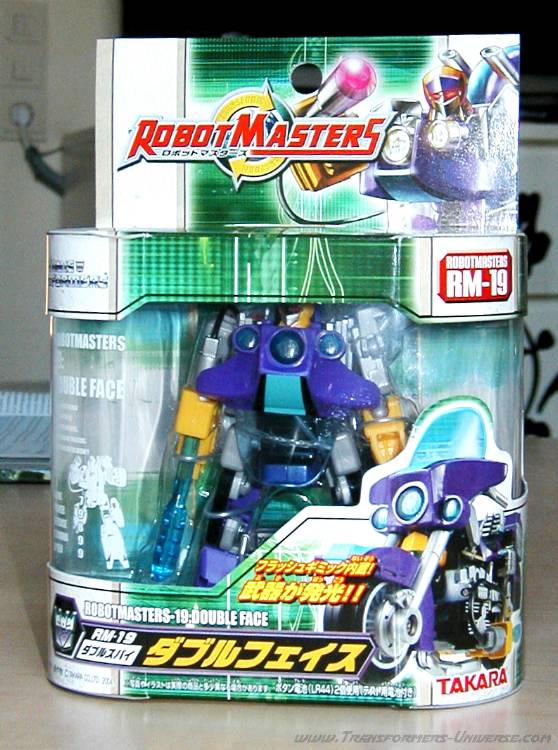 Remarks: Double Face is a repaint of the G2 Lasercycle Road Pig from 1995. The mold was recoloured once before for the Robots in Disguise series under the name Axer in 2002. Interestingly enough Axer was available in a two-pack with RID Sideways, with Double Face being a clear homage to Armada Sideways. Finally, RID Sideways (aka G2 Road Rocket from 1995) was recoloured into another Robot Master toy and given his old G2 name Road Rocket. Understood all that? Good, going on then.