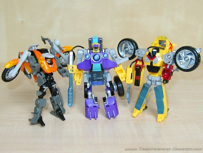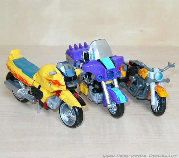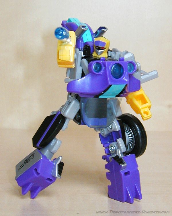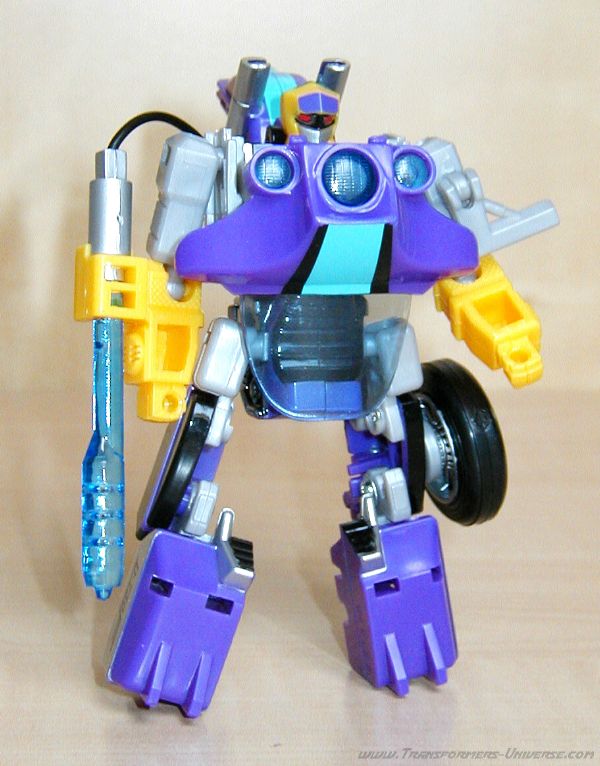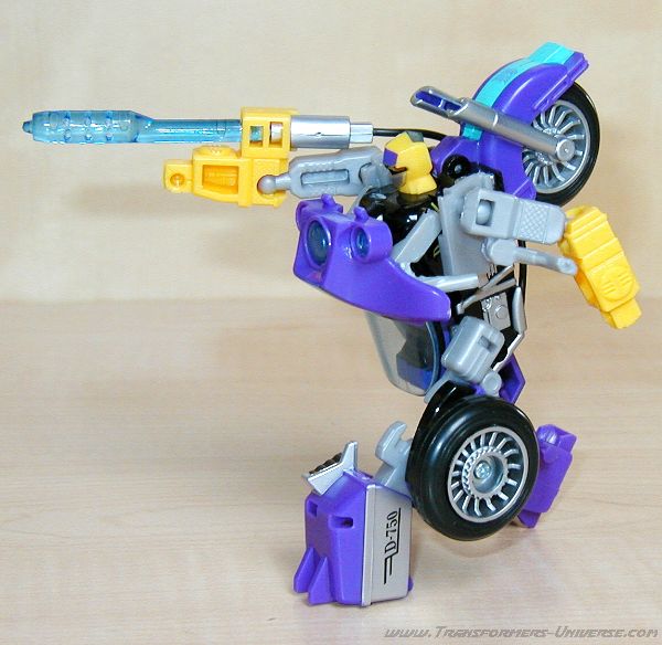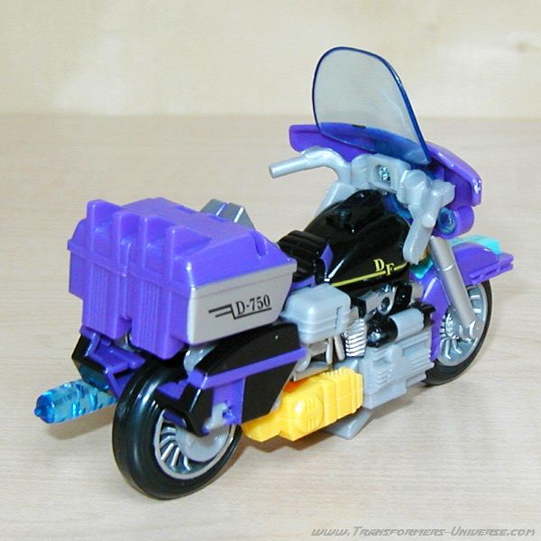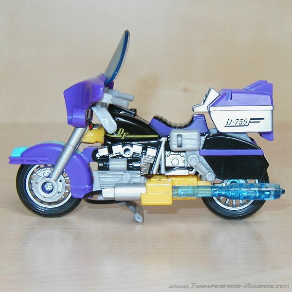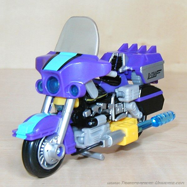 Alternate Mode: A motorcycle serves as Double Face's alternate mode and it does the job pretty well. Not sure if it's supposed to be any specific model. The light-up laser rod from his robot mode becomes the side-mounted exhaust stack here and it still lights up in this mode as well. Don't ask me whether the numbers on Double Face's flank have any specific meaning. D is probably for Destron, but apart from that...? Anyway, a very nice vehicle mode. No complaints at all.