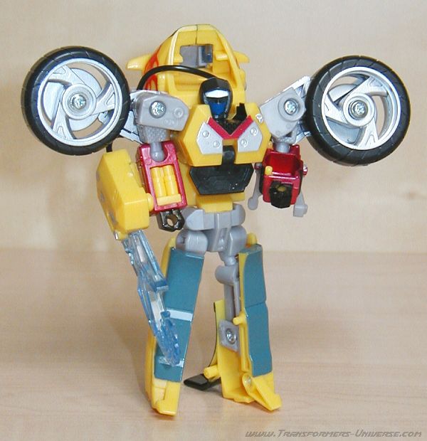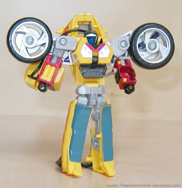 Robot Mode: Road Rocket is a nice little robot with enormous shoulders that make him look much bigger than he really is. His posability is quite good thanks to balljoints, though the motorcycle parts hanging off him somewhat restrict him. Balance isn't a problem, though, thanks to his big feet, and he can pull off some decent poses without problems.