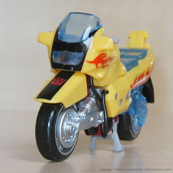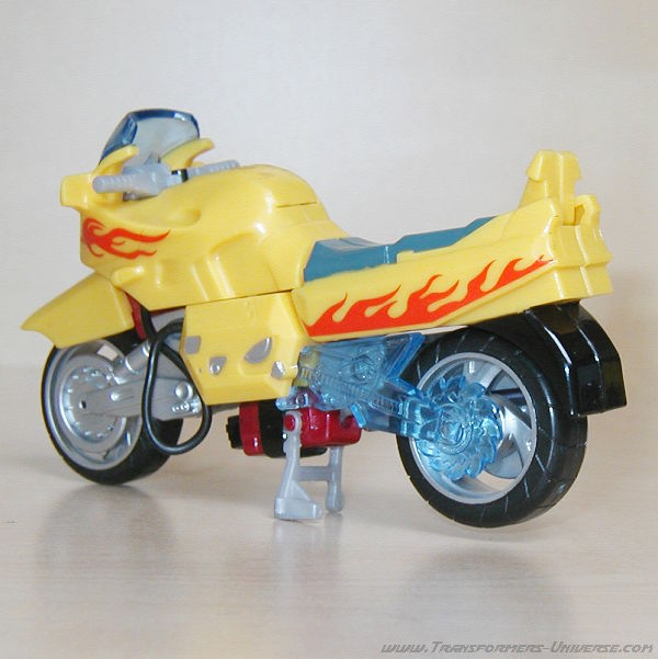 Alternate Mode: Road Rocket transforms into a yellow motorcycle with flames painted on the sides and the chainsaw weapon fastened at the side as a sort-off exhaust pipe. Not really that much I can write here. The detailing on the bike is nice and it includes a stand you can flip out below. Not bad. If you look very closely you can see one of Road Rocket's robot arms sticking out below, but it's not really all that noticeable. So overall a decent, if unspectacular vehicle mode.