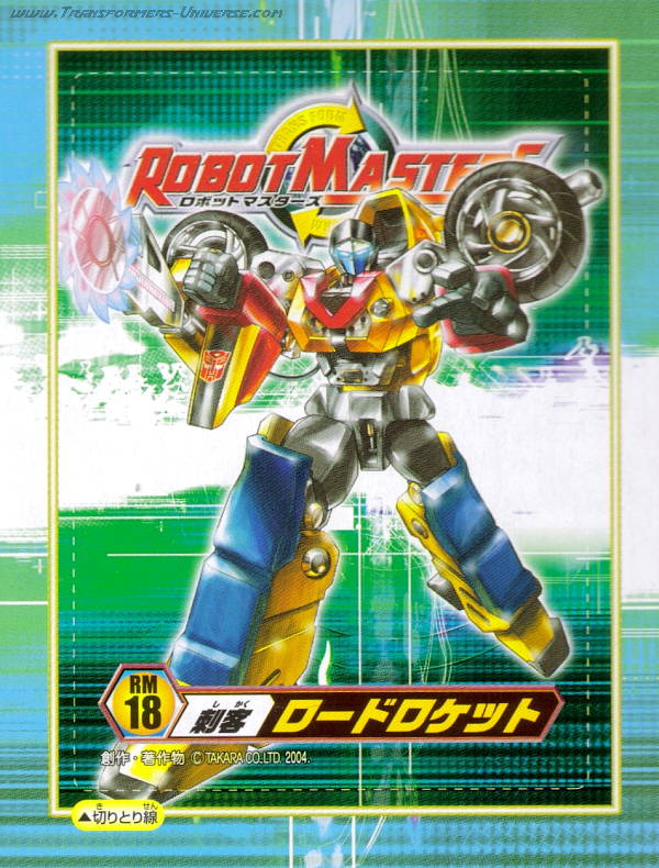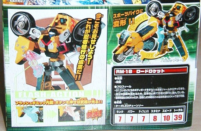 Remarks: Road Rocket is a repaint of the G2 Lasercycle of the same name from 1995. The mold was recoloured once before for the Robots in Disguise series under the name Sideways in 2002. Sideways was available in a two-pack with RID Axer, who was recoloured into another Robot Master toy, namely Double Face. These G2 molds sure are popular in the Japanese series. Just don't ask what ninjitus has to do with driving faster. You'll only get a headache.