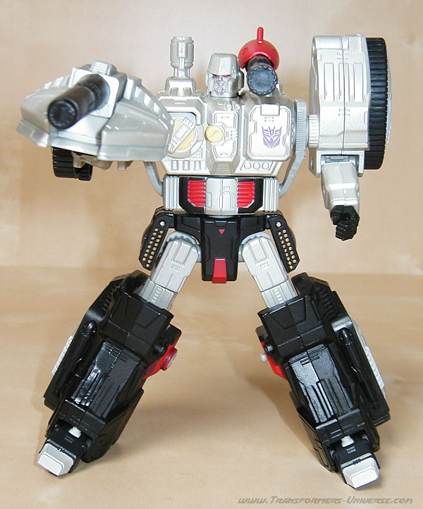 Robot Mode: Megatron as he appeared in the War Within comic has quite a bit of resemblance to his G1 incarnation (more the Masterpiece version rather than the actual G1 figure), though his alternate mode is obviously not a gun, but rather a tank, evident by the tank threads on his arms and legs. He is also quite heavily armed, featuring a shoulder-mounted cannon and a hand weapon he can either hold separately or mounted on the 'shield' he also carries. The hand weapon is made of rather soft rubber and tends to point down a bit, but it's not a big problem.