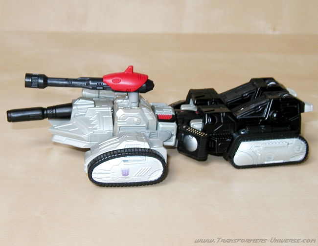Alternate Mode: Let's not beat around the bush here. Megatron is supposed to be some kind of Cybertronian tank in this mode and there are certain angles where he looks pretty good. But from most angles he just looks like a robot lying on his stomach. Which essentially he is. Megatron pretty much just lies down, twists his upper body around, puts his 'shield' on top of his head, and that's it. So what should be an imposing military vehicle is just Megatron doing push-ups. Some elements of the tank do look good, the overall detailing is quite nice and he offers lots of firepower, but again: It's a robot lying on his stomach. There is simply no getting around that, sorry.