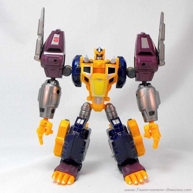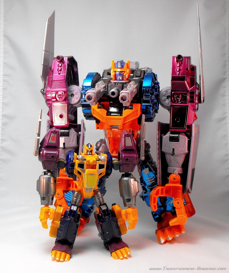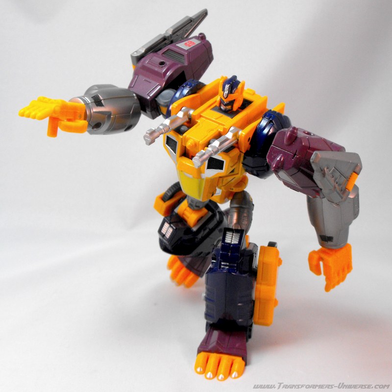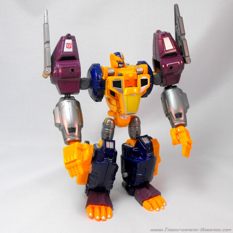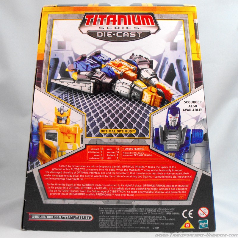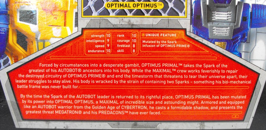 By the time the Spark of the Autobot leader is returned to its rightful place, Optimus Primal has been mutated by its power into Optimal Optimus, a Maximal of incredible size and astounding might. Armored and equipped like an Autobot warrior from the Golden Age of Cybertron, he casts a formidable shadow, and presents the greatest threat Megatron and his Predacons have ever faced.