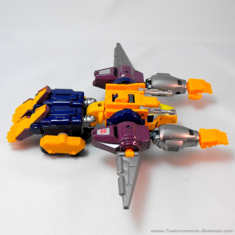 Now calling the jet and the ground transport two different modes is pushing it a little, I admit. Basically both modes have the robot lying down on his stomach, flipping out wheels from the legs and folding out a cockpit. The only difference is in the positioning of the robot arms. For the ground transport the arms form a V around the cockpit and interlock with the front wheel that folds out from underneath the cockpit. Said wheel stays in for the jet mode and the arms are positioned at the sides with the wings flipping out. Thus the two modes don’t really look that different from another nor, for that matter, can either disguise that it’s really a robot lying on his stomach here. It’s the same with the original Beast Wars figure, of course, so it’s a faithful translation.