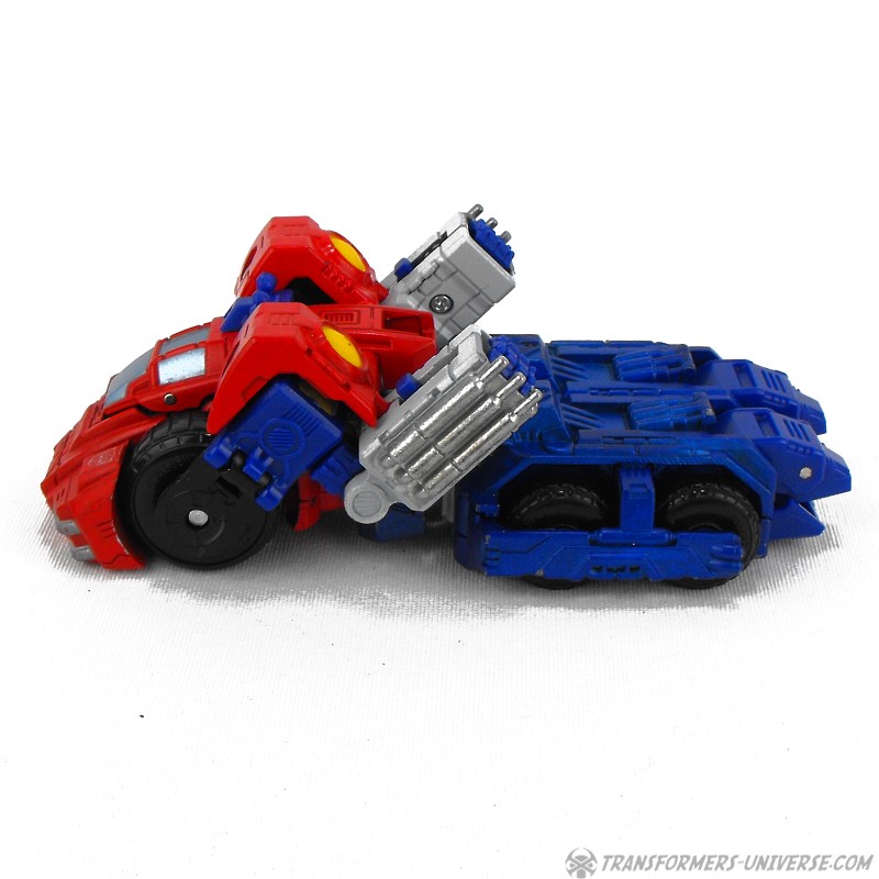 Alternate Mode: I'm really of two minds about Optimus' vehicle mode here. The front half of it looks pretty cool, no doubt. The rear half, though... there is very little done to disguise the fact that these are in fact the robot's legs. Plus there is some design problem here as well, as the cockpit doesn't properly close with the front of the vehicle's main body. Might just be a problem with my figure and not a general thing, but it does add to the figure's engineering problems. So all I can say about this vehicle mode really is, look at the front half or leave it in robot mode.