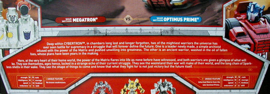 Deep within Cybertron, in chambers long lost and longer forgotten, two of the mightiest warriors the universe has ever seen battle for supremacy in a struggle that will forever define the future. One is a leader newly made, a simple archivist infused with the power of the Matrix and pushed unwilling into greatness. The other is an ancient warrior, washed in the oil of fallen foes, whose plans have been years in the making.