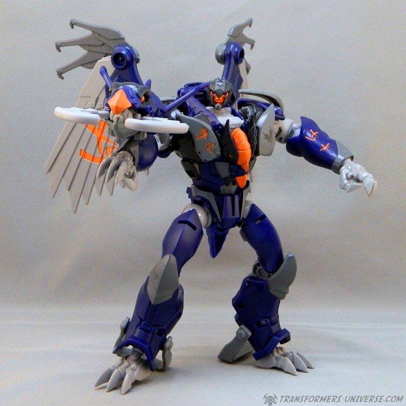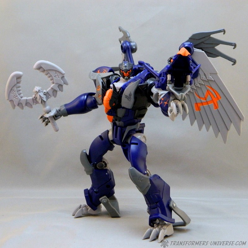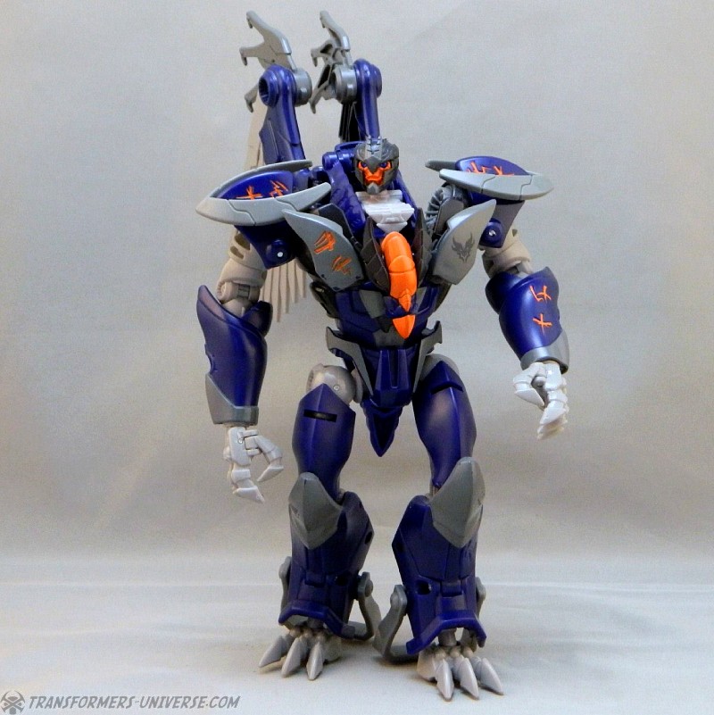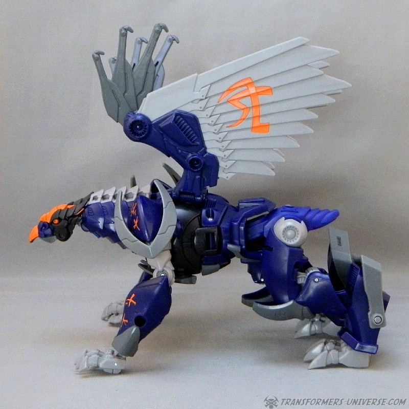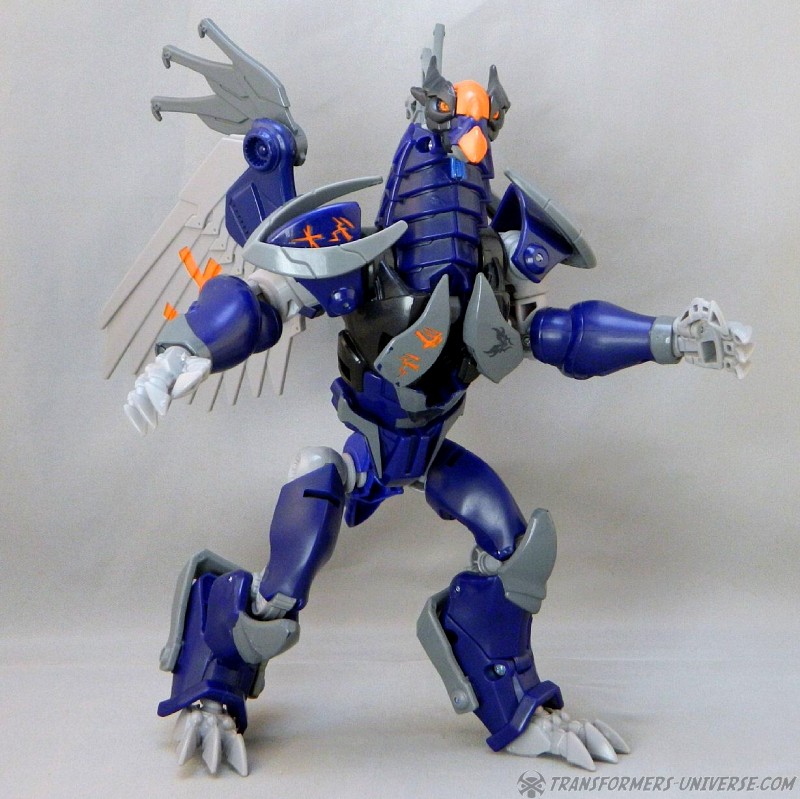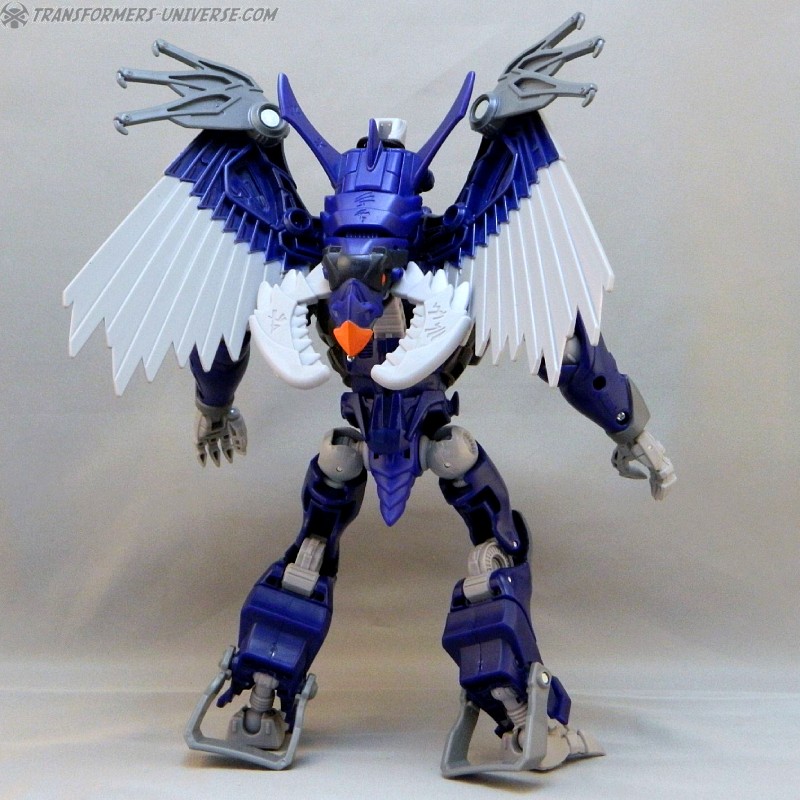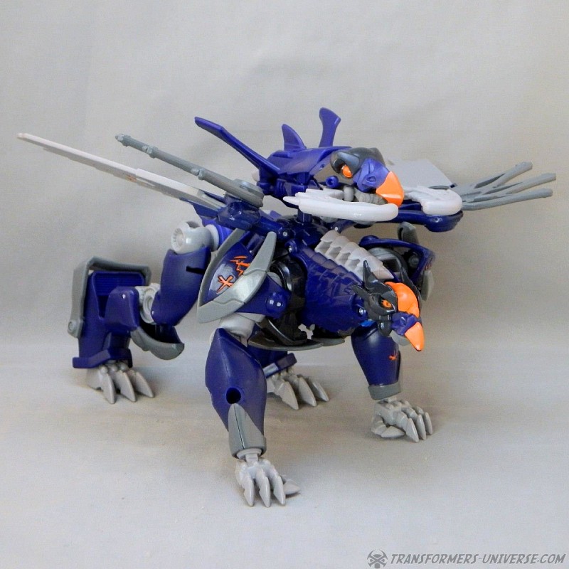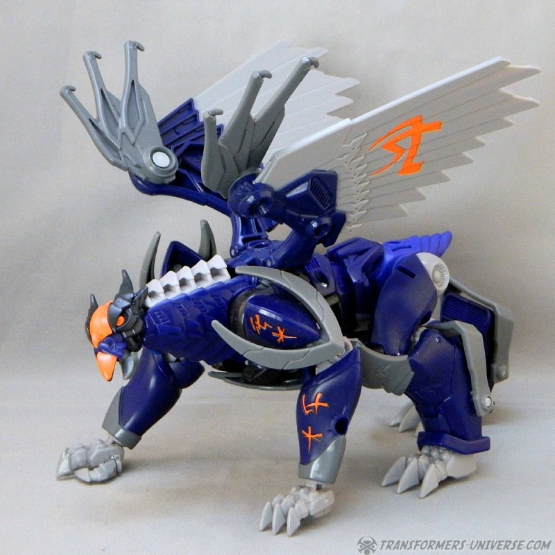 Remarks: Darksteel is a straight-up repaint of Beast Hunters Grimwing, whom I have previously reviewed. He was part of the Target-exclusive "Rise of the Predacons" subline and, unlike the much easier to find Grimwing, actually appeared in the Predacons Rising TV movie. The Robots in Disguise sequel later revealed that he, along with the other Predacons, was tricked and killed by Starscream, a rather inglorious ending for what was supposed to be a near-invincible beast. Anyway, Darksteel looks great in blue. Still doesn't explain why this mold was never retooled into Beast Wars Silverbolt.