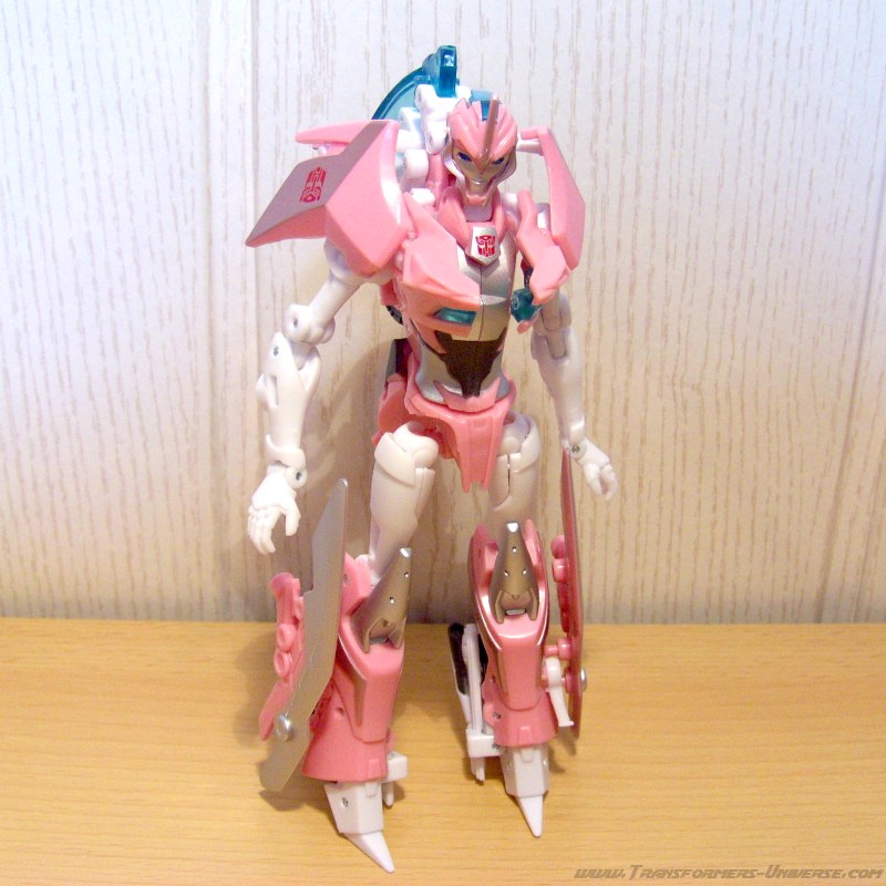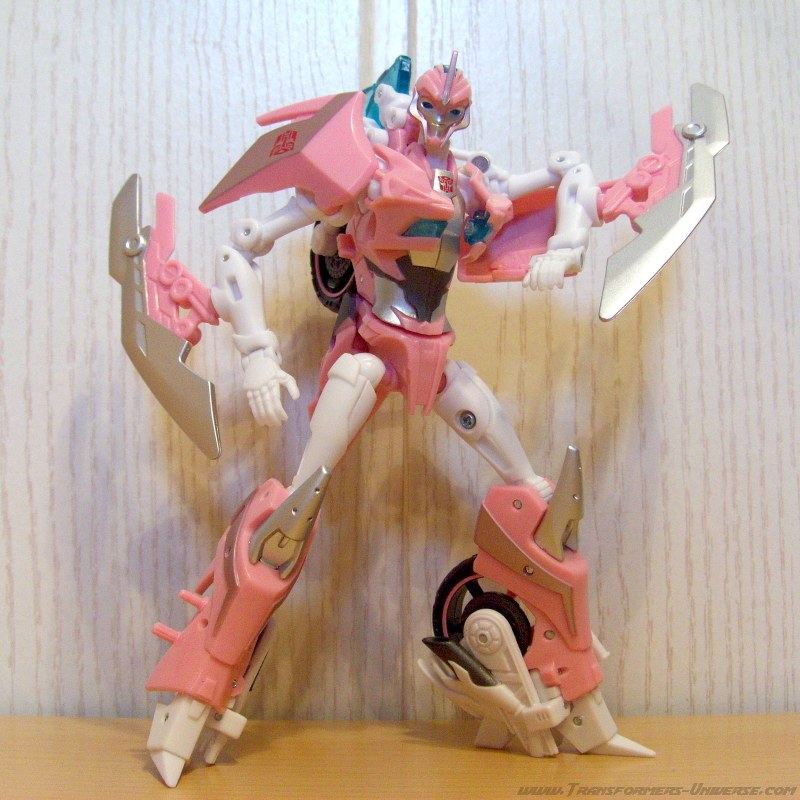 Robot Mode: Now, here is where Arcee really shines! What you get after transformation is a really, really awesome-looking figure overall. The size and looks are just stunning. For me, it has been a long time since a figure just blew me away just by looking at it. The proportions are really nice, definitely female, and everything from the show is there as it should be. Posabillity is just great and even better than what Movie or even Animated Arcee was capable of. Everything you see in the pictures, even standing on one leg, was done without any support, all on her own. She has very nice details and a pretty, female face, too. Mass and size are pretty much the same as with the Movie and Animated versions.