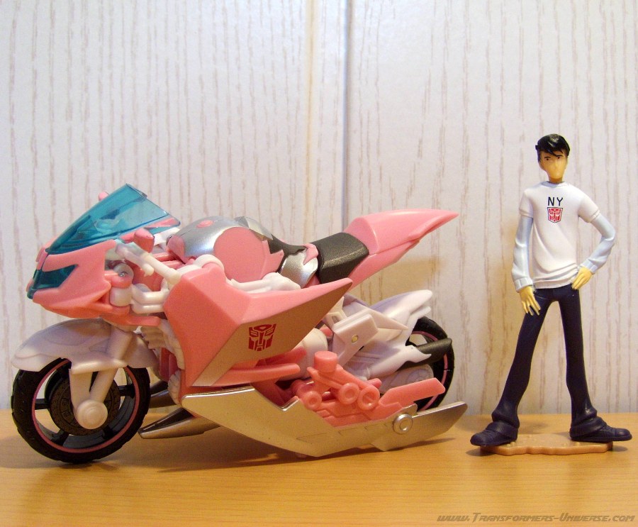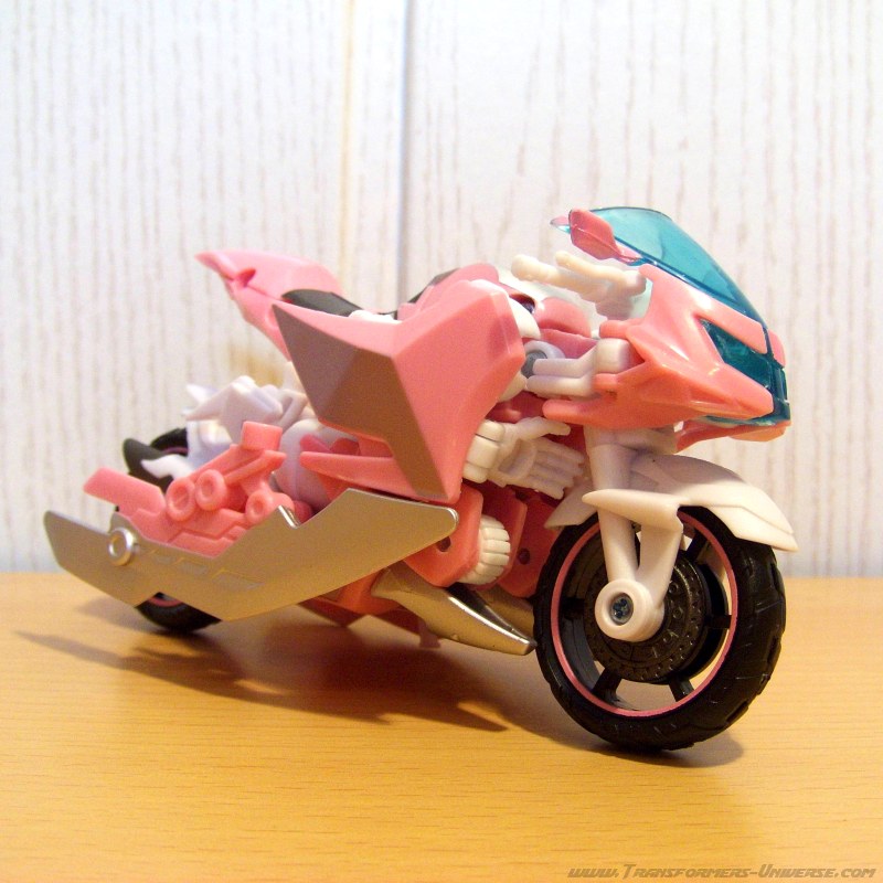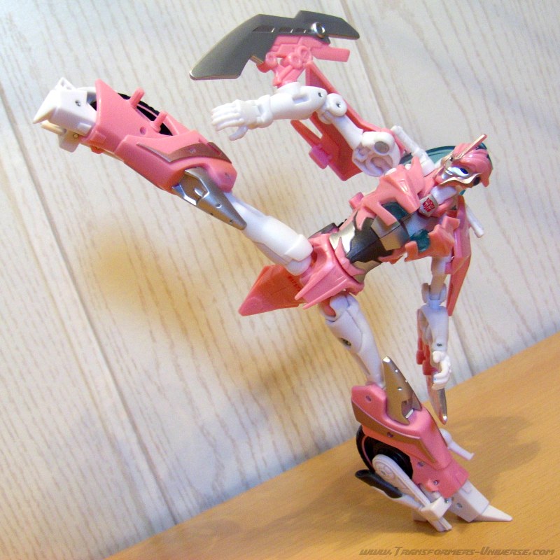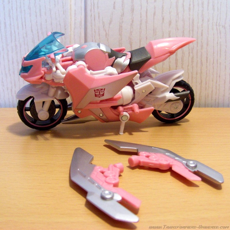 For gimmicks, well, she has a kick-stand but you do not need that when the arm-blades are attached to the bike. They will hold her up just fine. Personally I find it a little sleeker and cooler-looking without the blades attached. The peg holes for them even remind me of the pedals on a real bike. Overall a very nice mode and not really that much to complain about, except for the excessive use of pink. It is nothing special or never-seen-before, but it does nicely when comparing her to what she looks on screen.
