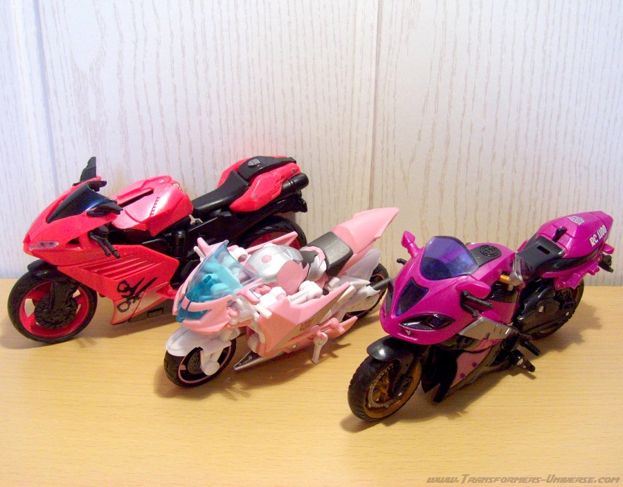 Otherwise there is not much to say. It is a good toy version of what you saw on screen, only this time in white and pink. Very pink that is, even a little too much for a bike. The Movie version did a better job with it since she had more white and a little less pink. Still, very nice. The Prime toy gives the wheels - or rather the rims - a pink circle around them. Reminds me of the Animated Style and I really like that. In terms of mass I think they are pretty similar, only the Prime version is more compact and therefore a little smaller in size, but with more bulk.