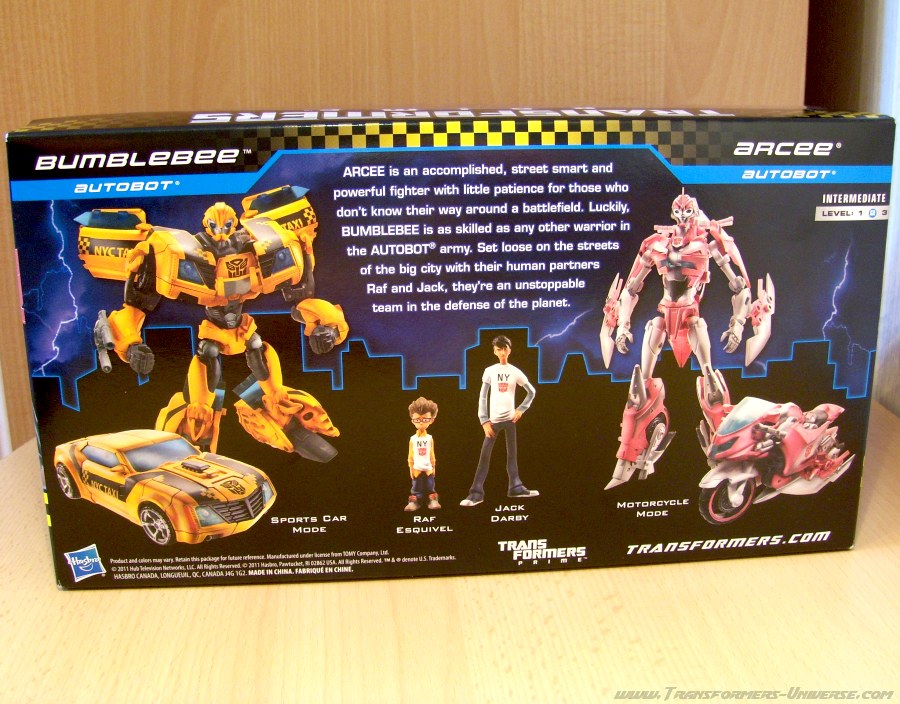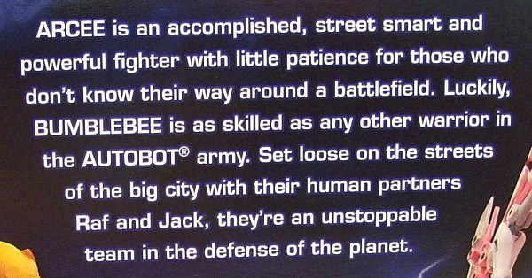 Arcee is an accomplished, street smart and powerful fighter with little patience for those who don't know their way around a battlefield. Luckily, Bumblebee is as skilled as any other warrior in the Autobot army. Set loose on the streets of the big city with their human partners Raf and Jack, they're an unstoppable team in the defense of the planet.