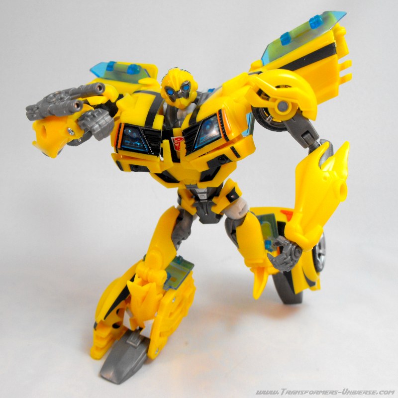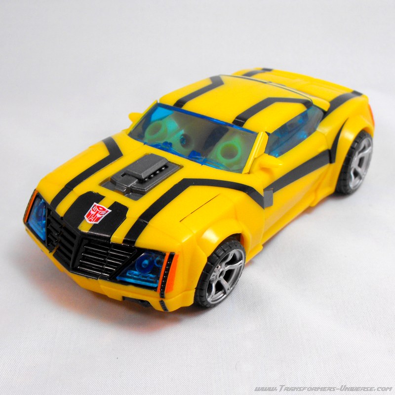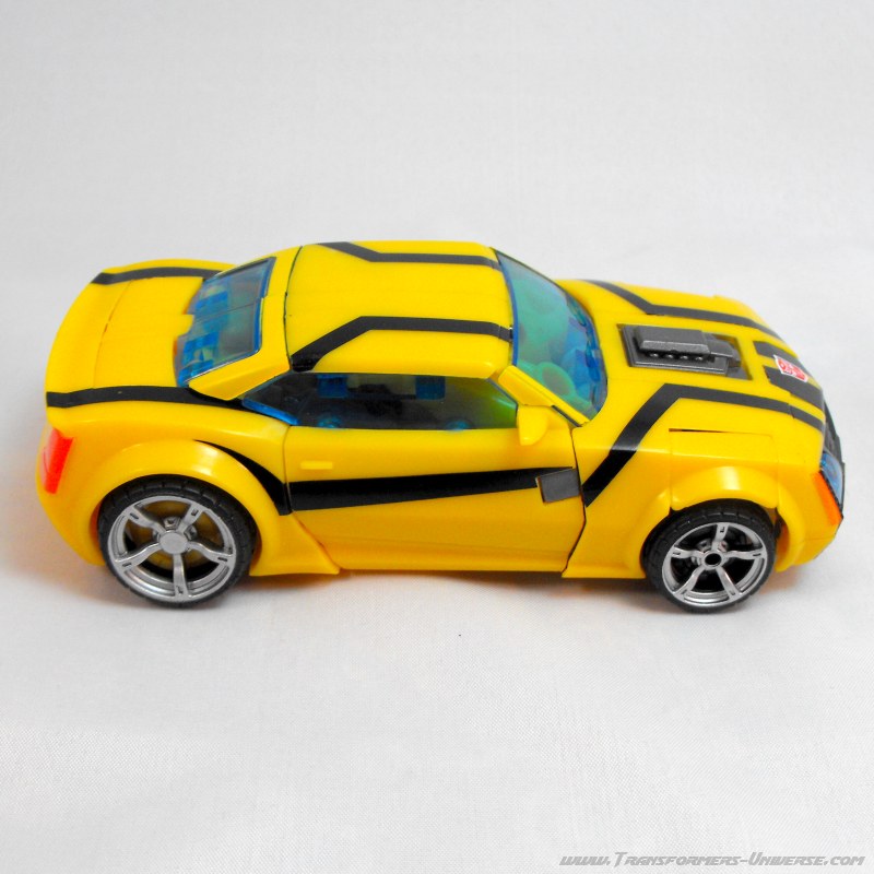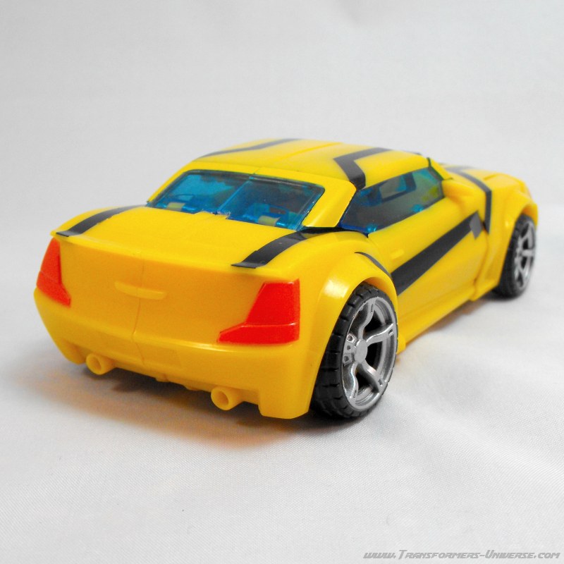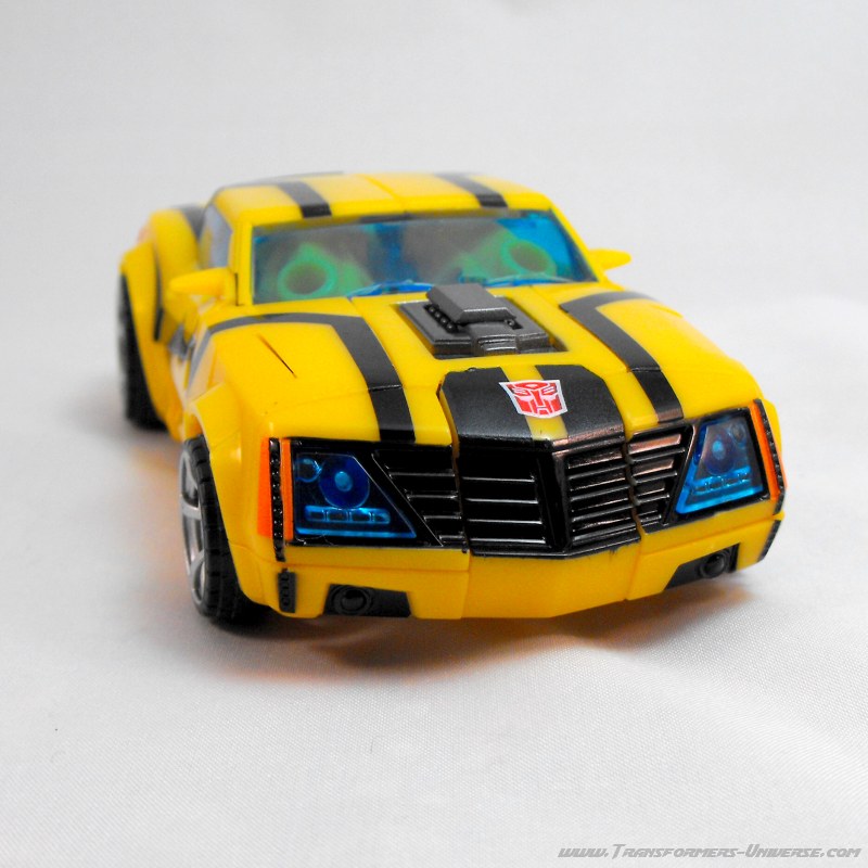 Alternate Mode: Shockingly Bumblebee transforms into a yellow car with black racing stripes, who would have guessed? It’s not a Camaro this time, more of a generic muscle car with the engine sticking out from the hood and a huge front grill. Apart from the black racing stripes, silver rims, red stop lights, and blue-tinted windows break up the yellow monotony. There’s also an Autobot symbol on the hood.