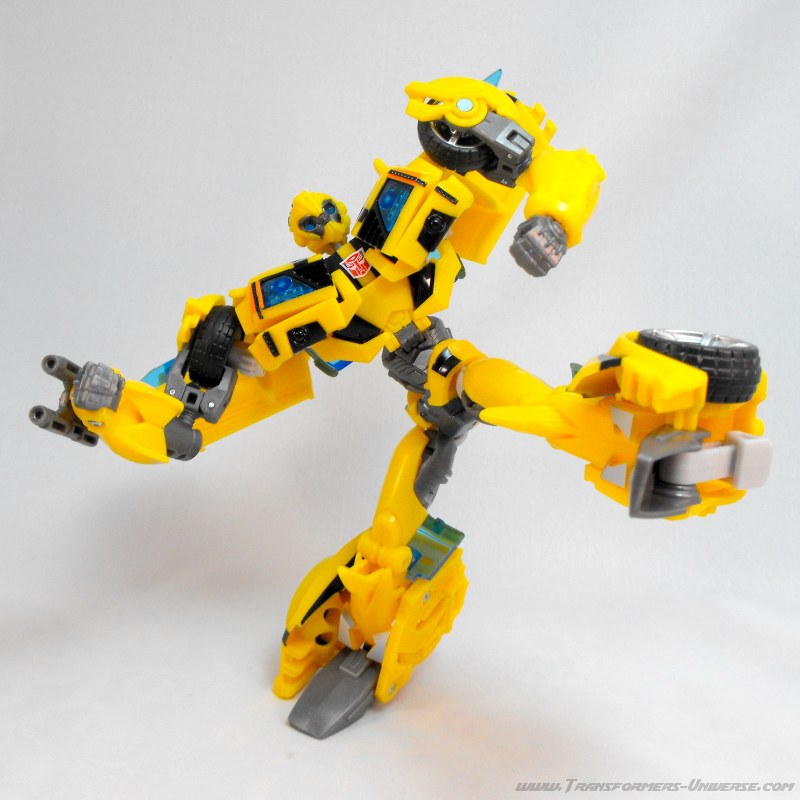 Finally, articulation. Bumblebee is as agile as you’d expect from a modern-day Transformers figure, including a twisting hip. The arrangement of the shoulders takes a moment to get used to, but it doesn’t hinder him in any way. The big feet make for a stable platform, so outrageous poses and kicking stances are not a problem, either. Just about the only thing he’s missing are twisting wrists, but he can twist his forearm, which mostly negates that limitation. Bottom line: A good robot mode whose only real downside is that the character depicted has been vastly overexposed these last few years.