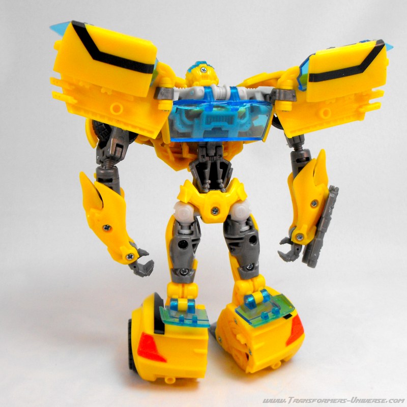 Robot Mode: There is very little doubt where the inspiration for this robot comes from. Prime BB is very similar in look to the various Movie Bumblebees, from the angled car hood as chest to the rear of the car as feet. Now if you’re sick to death of seeing yet another variation of Movie BB, welcome to the club, but in this case there are, in fact, some changes that make this new BB bearable. Overall the look, while clearly Movie-inspired, also has some of the softer Animated-styling as well. The head isn’t quite as bug-eyed. Some other subtle differences elevate this robot mode above being yet another Movie BB.