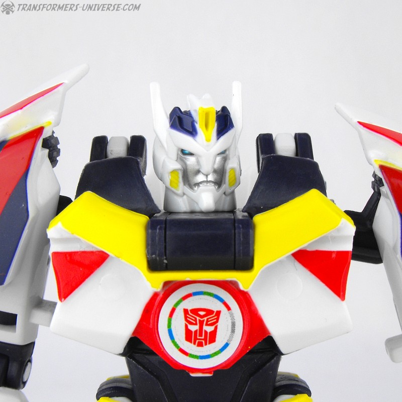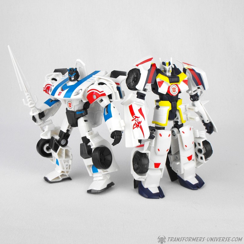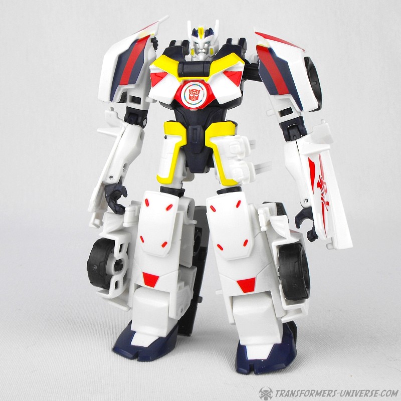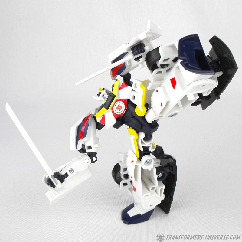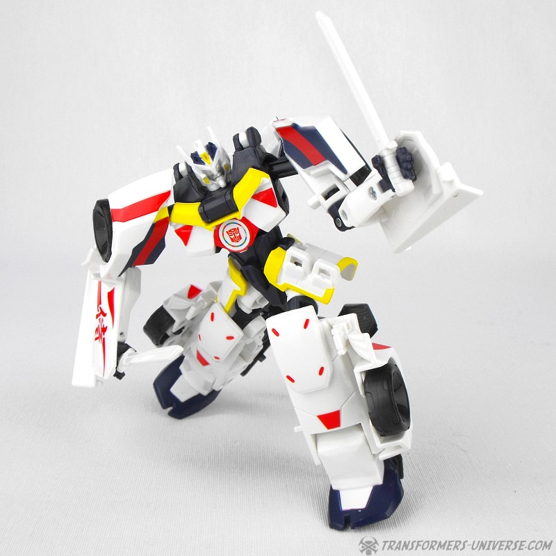 Robot Mode: The body remains the same, but it has gotten a completely new paintjob and a new head, both clearly paying homage to Generations Drift, the first Drift toy. Drift is now mostly white with black, red, and yellow detailing. The new head lacks the Samurai look of the Robots in Disguise version and instead adheres closely to the noggin’ of the original Drift toy. Suffice to say Drift looks fabulous in this new ‘do and almost like a completely different figure than the RID one. Very nicely done.