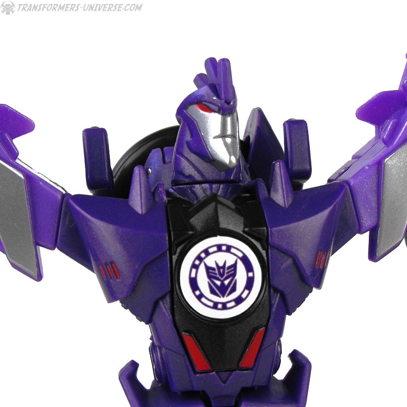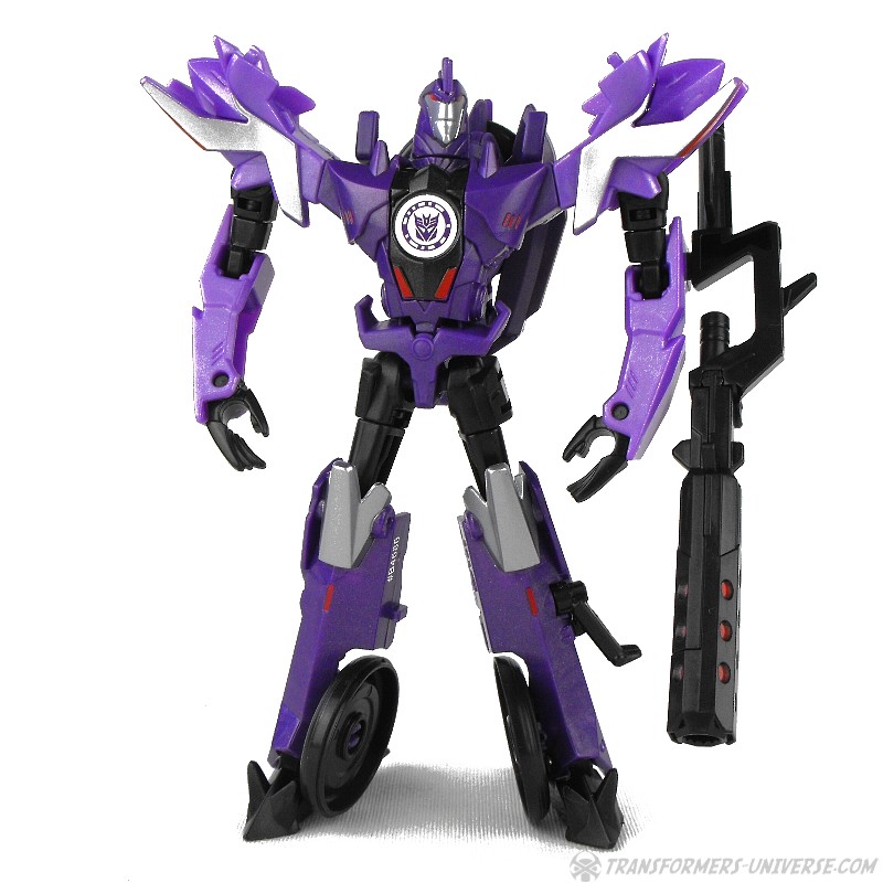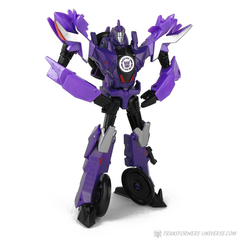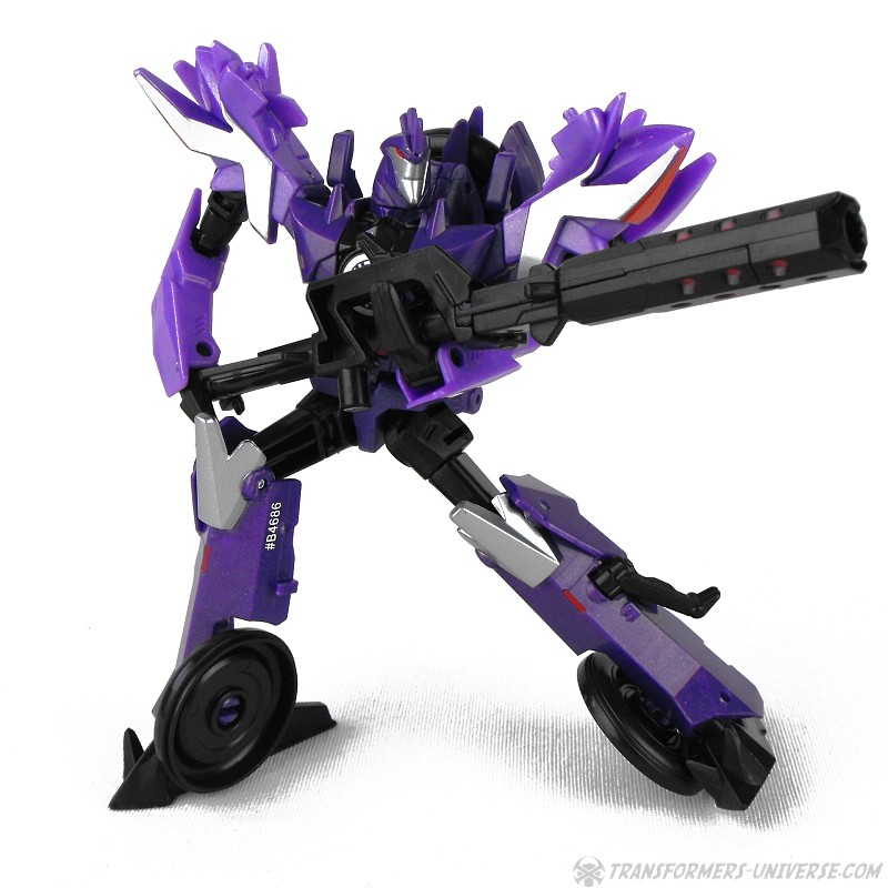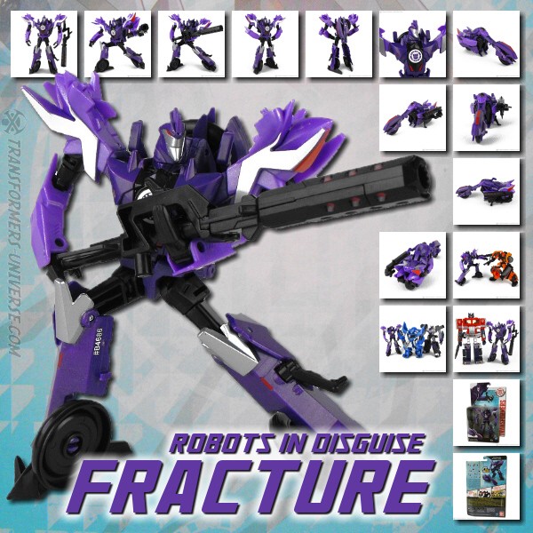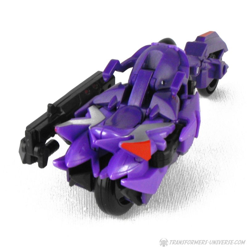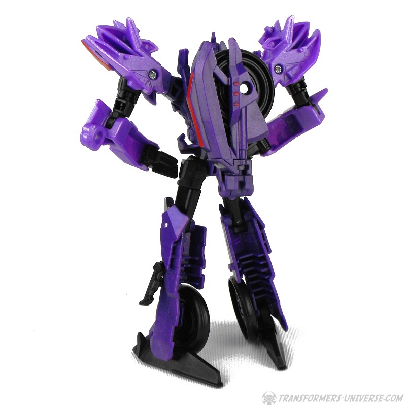 Robot Mode: Fracture is a robot sporting the traditional Decepticon colors (purple, black, silver). He is long and thin, with big shoulder pads (including sculpted-in Minicon missiles) and a long, narrow face. Overall it would be quite hard to imagine him as one of the good guys. Also, it’s kind of hard to say what he transforms into (at least from the front), the black tires on his feet pretty much the only clue.
