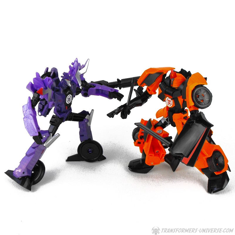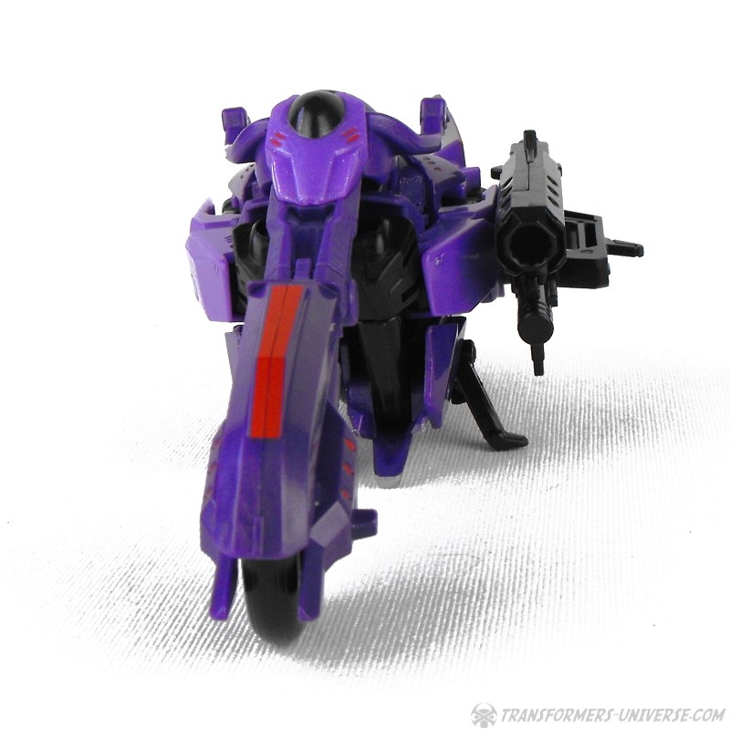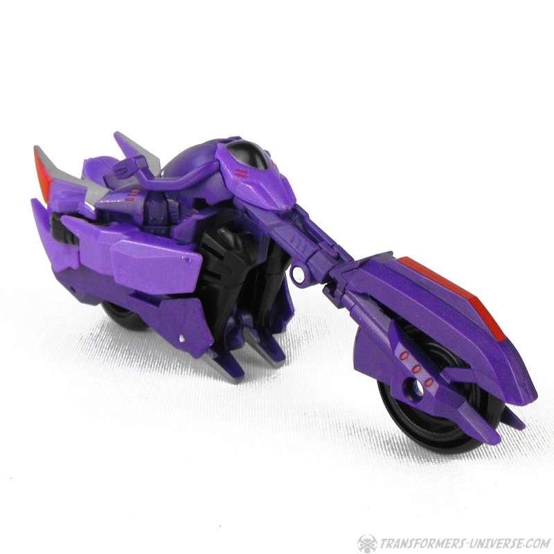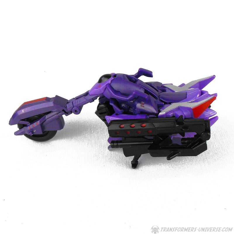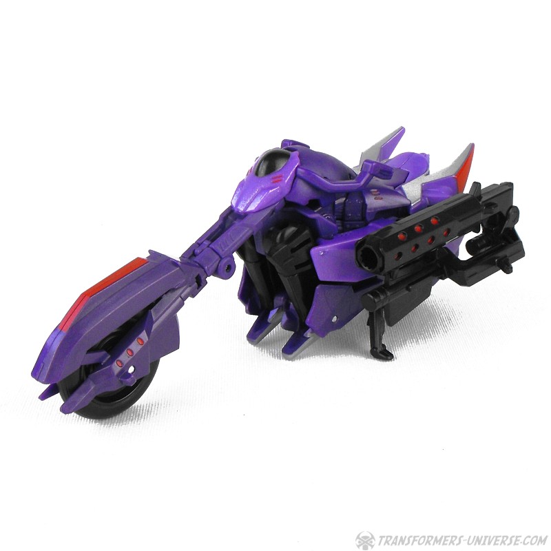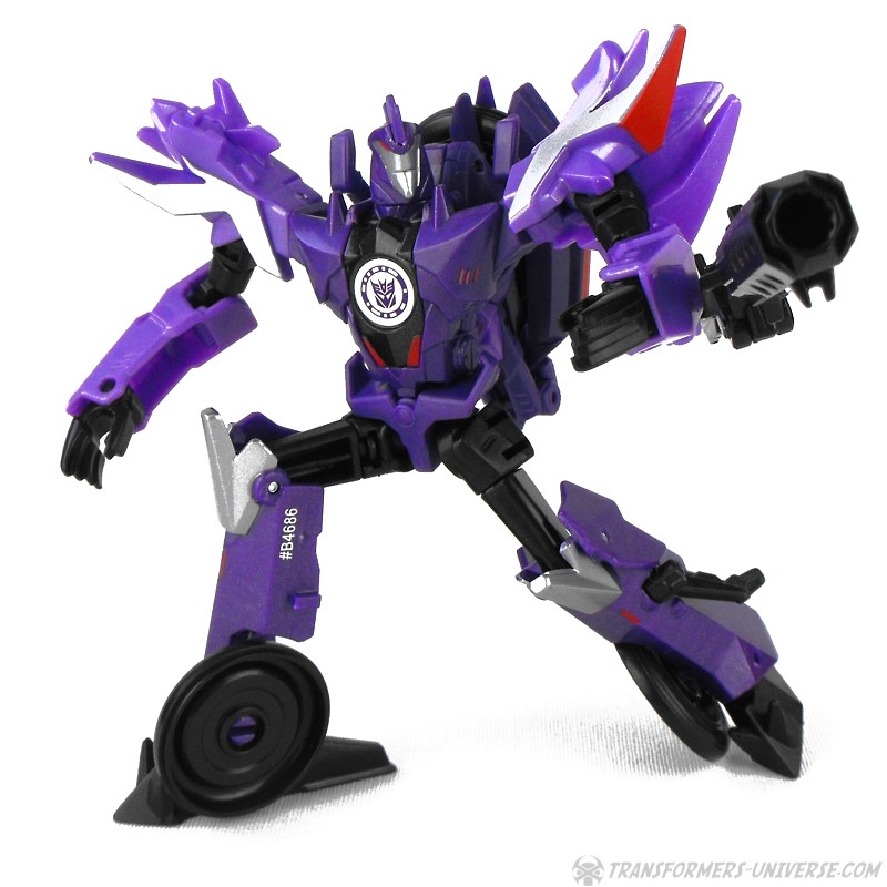 Robot Mode: Fracture is a robot sporting the traditional Decepticon colors (purple, black, silver). He is long and thin, with big shoulder pads (including sculpted-in Minicon missiles) and a long, narrow face. Overall it would be quite hard to imagine him as one of the good guys. Also, it’s kind of hard to say what he transforms into (at least from the front), the black tires on his feet pretty much the only clue.