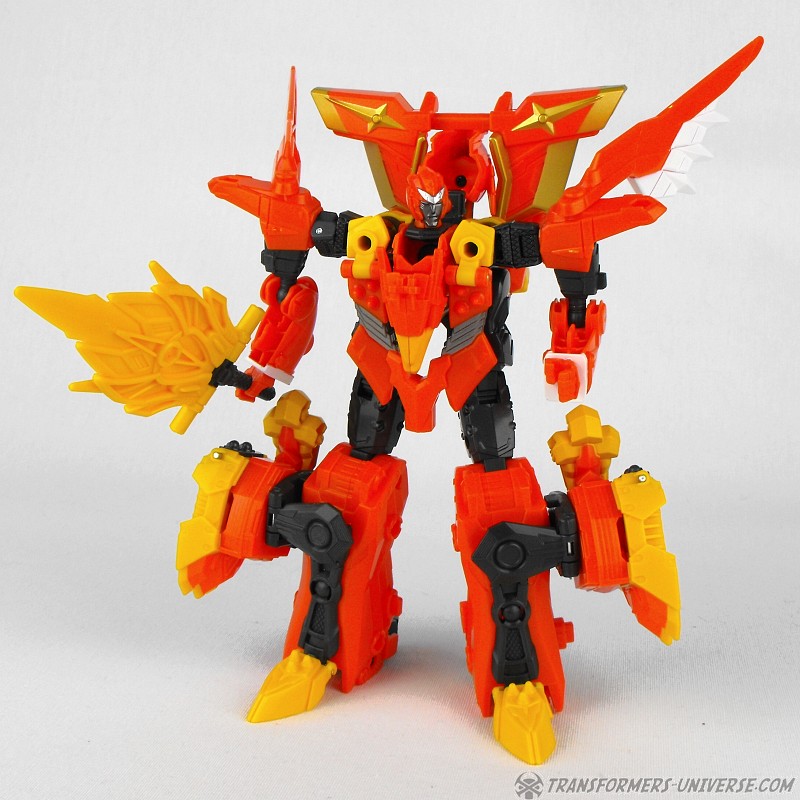 Proportions aside Hishoumaru looks pretty good overall, too. The orange, black and yellow paint job suits him well, he is almost kibble-free (just those big pods on the legs), and I have a thing for winged robots anyway. He has a solid stance, no balance problems, and can pose with the best of them. For a weapon he carries a pretty broad sword (a fan sword according to his profile) and, like all of the Swordbot robots, he can use the combiner helmet as a very strangely-shaped gun as well. Alternatively he can also store the combiner helmet on his back. So overall, a really nice robot mode. The best of the Shinobi team and a tough contender for Ganoh when it comes to best Swordbot robot mode overall.