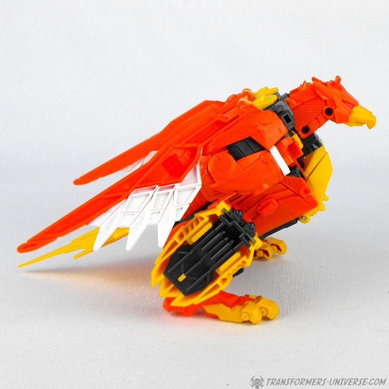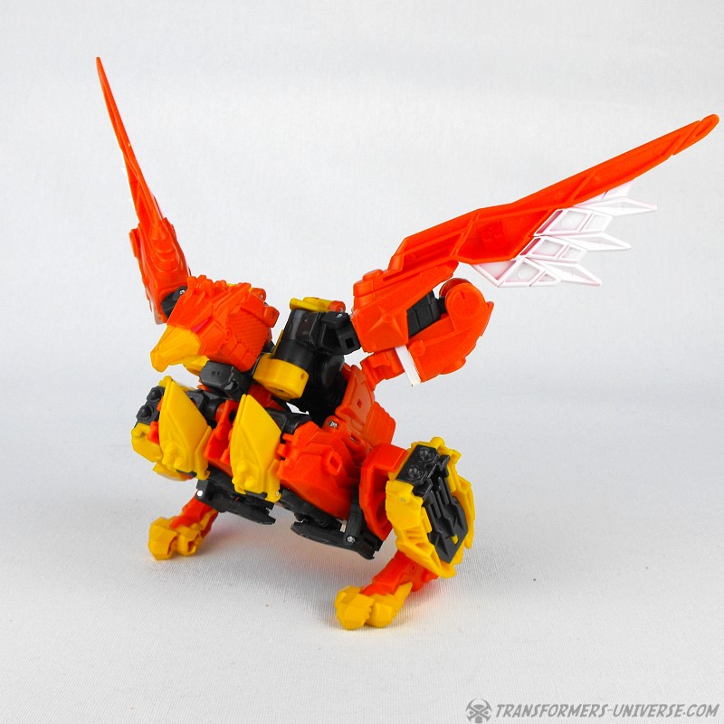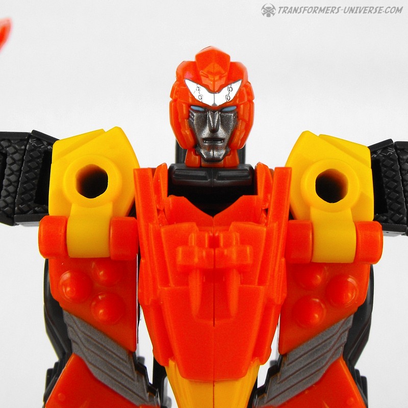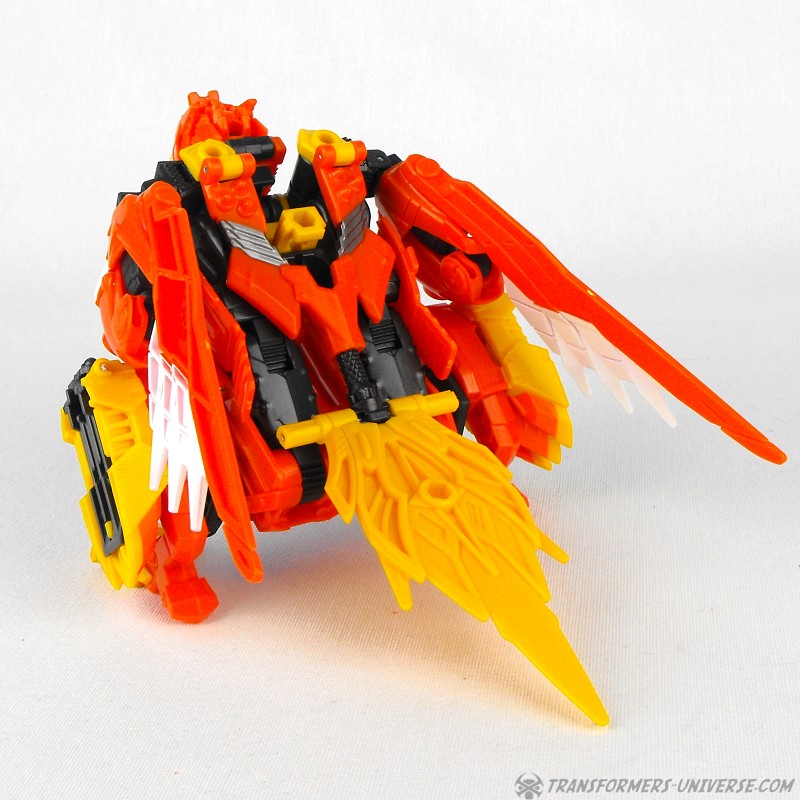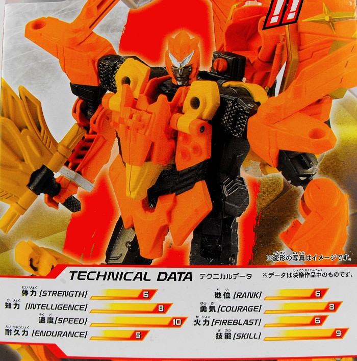 Part of the Autobot army stationed against the Predacons. Member of the commando "Shinobi Swordbot Team." Specializes in wind based ninjitsu called: "Wind Hawk Shinobi." Despite his brilliant appearance he is light hearted yet sets the mood for the Shinobi team. His tail transforms into flight fans putting the Predacons at his mercy with his skill of manipulating wind. Treats Fuma as if he were his big brother yet is oblivious that he treats him this way.