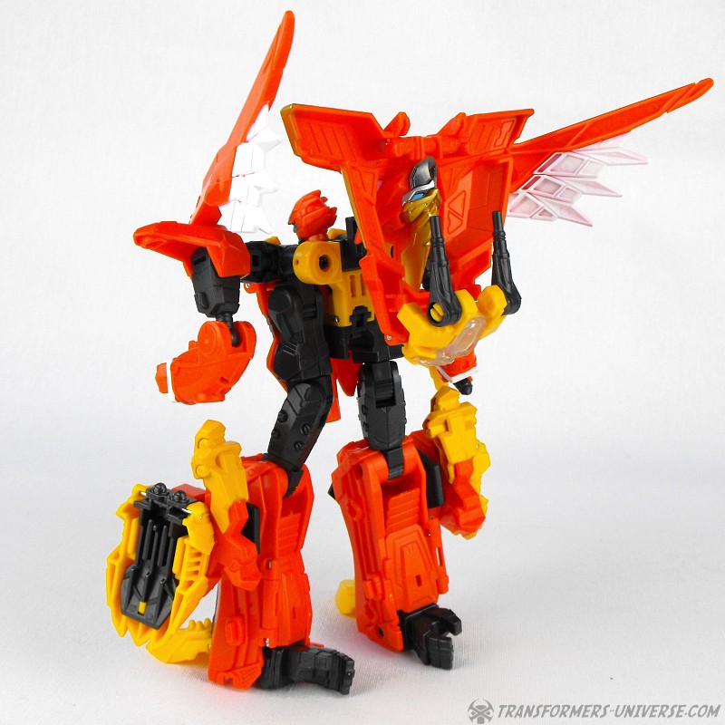 Alternate Mode: Hishoumaru transforms into a robotic hawk (or similar bird of prey). Now bird Transformers are a very mixed lot, usually, as the robots seldom know where to put the robot legs (Energon Divebomb did it best, in my opinion). Hishoumaru folds them up to serve as the bird’s chest, making for a rather unrealistically proportioned hawk, given that its chest and torso are pretty wide, while the wings are relatively small. Still, the overall image is okay. Not brilliant, but okay. Given that Hishoumaru has to incorporate three different combiner modes into its design, too, the hawk mode is doing a pretty good job.