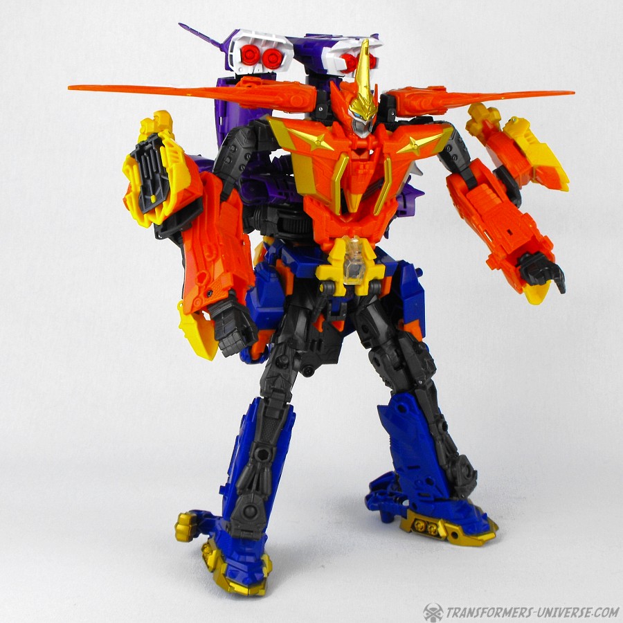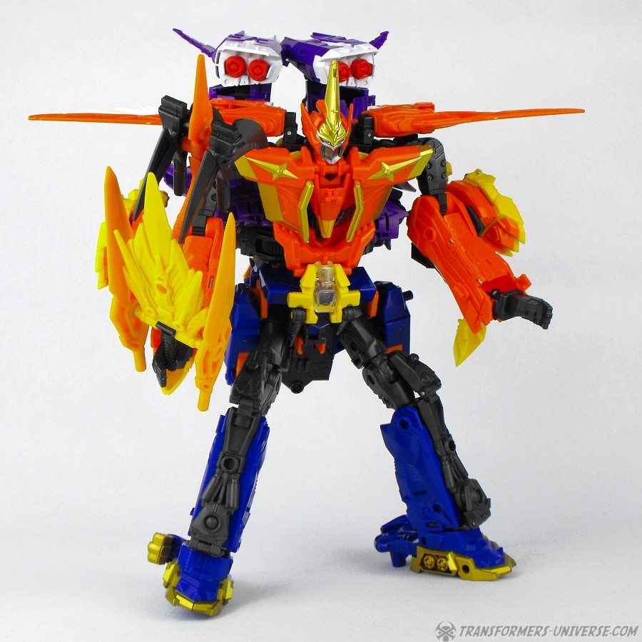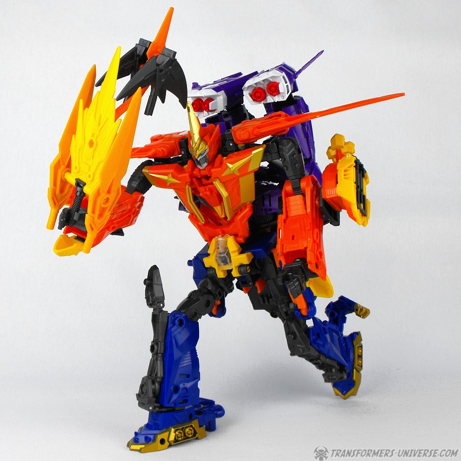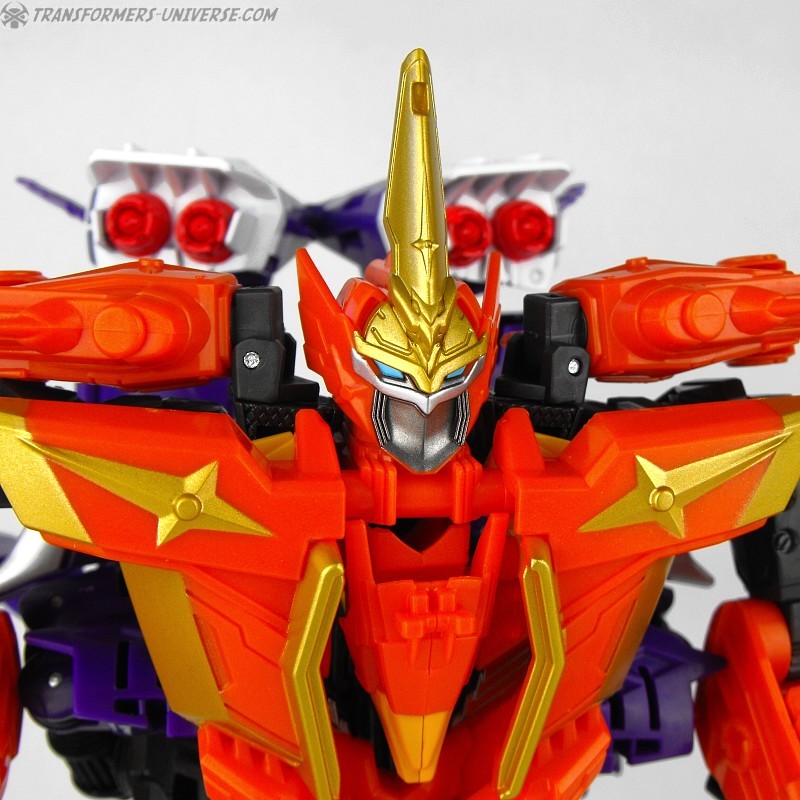 GoHishou uses Gekisoumaru as the lower body and Sensuimaru as the hip and back. This works out very well, giving him a solid and well-balanced pair of legs and Sensuimaru’s cool missile launchers as shoulder-mounted weapons (I’m a sucker for shoulder-mounted weapons). Hishoumaru makes for a good chest and pair of arms and the entire combiner looks very nicely proportioned . That he has Hishoumaru’s wings on his shoulders doesn’t hurt, either, of course. GoHishou can use the combined weapons of the entire team, just like the others, and is well articulated and pretty nicely balanced. So no complaints here. Definitely a well-done combiner.