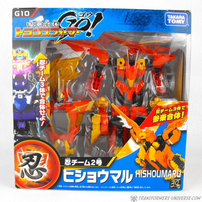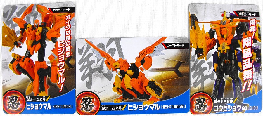 Combiner Mode: Hishoumaru can combine with fellow Shinobi team members Sensuimaru and Gekisoumaru in three different variants. In this review we shall look at the GoHishou variant, where Hishoumaru forms the upper body of the combiner. The other two variants are in the reviews of Sensuimaru and Gekisoumaru.