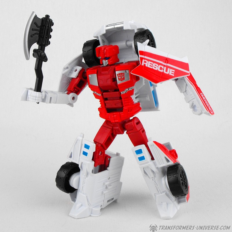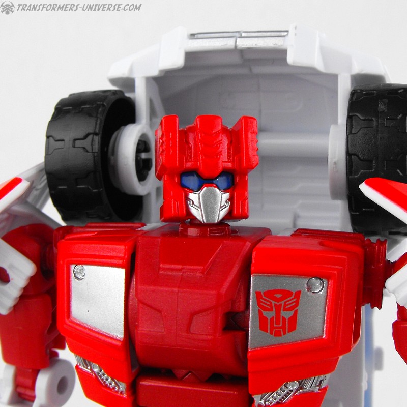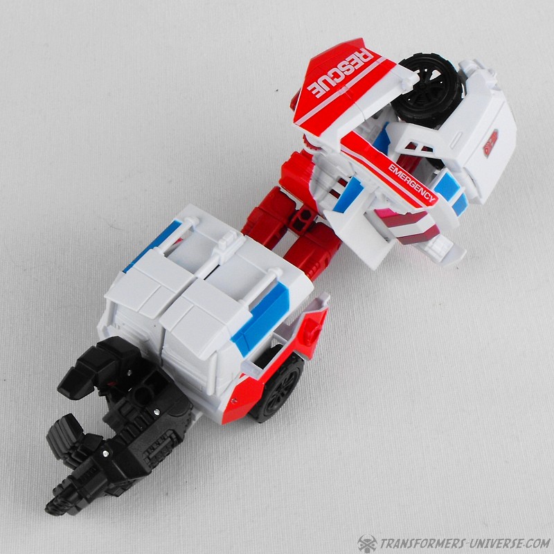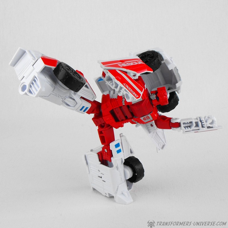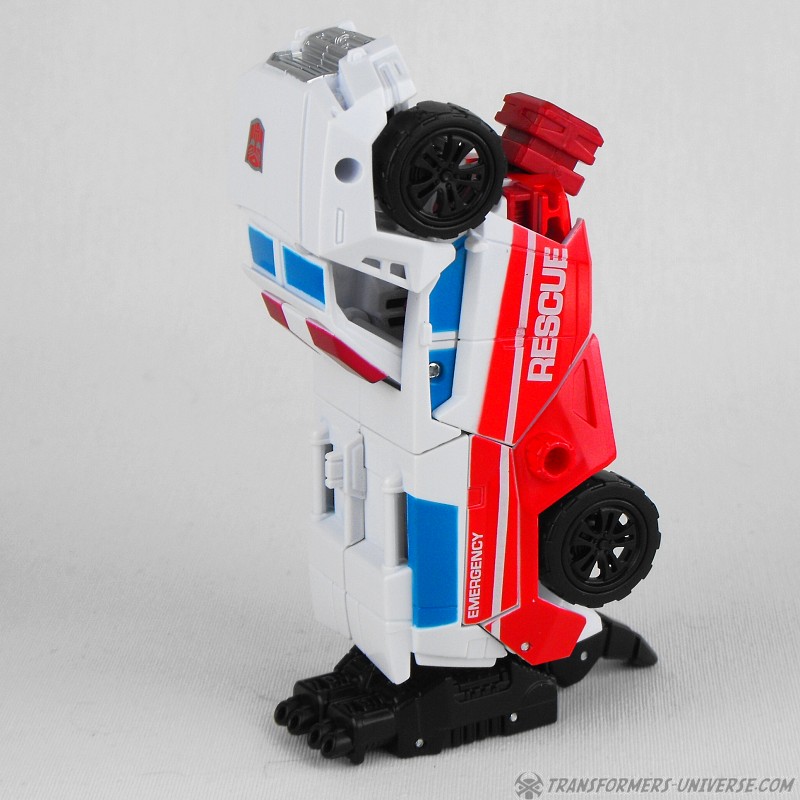 Robot Mode: First Aid might be the Protectobot who is closest in both look and design to his G1 predecessor. Bigger, of course, and far better articulated, naturally, but overall the two figures look very much alike. Red torso, white arms and legs, most of the vehicle shell on the back, even the look of the chest and head are very similar. So yes, no doubt, this is First Aid here.